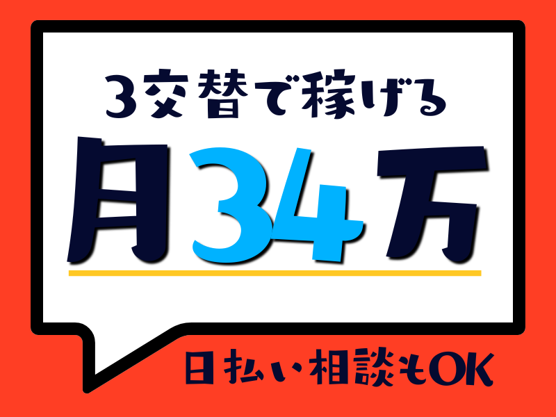 アピールポイント: \月収34万以上稼げる高収入ワーク!/ 3交替制だから未経験でも稼げるんです* お休みもしっかり土日休み×年休120日! * 5月スタート・15名以上大募集 * タイパよく稼げる月34万以上 * ワンルーム寮完備・家賃0円 * オープニングスタッフ募集 * 美味しくて安い社食あり(1食300円程度) * キレイな休憩室・ロッカー完備 * 土日休み×年休120日 * 正社員雇用で安定! * 地元から車通勤するスタッフ多数! * 福岡市内へも遊びに行きやすい* * 履歴書不要&スマホ面接OK ===前払い制度あり=== 日払いも、週払いもOKです! 今月ピンチ…そんな時に超便利! スマホのアプリでサクッと申請! \お気軽にご相談ください!/