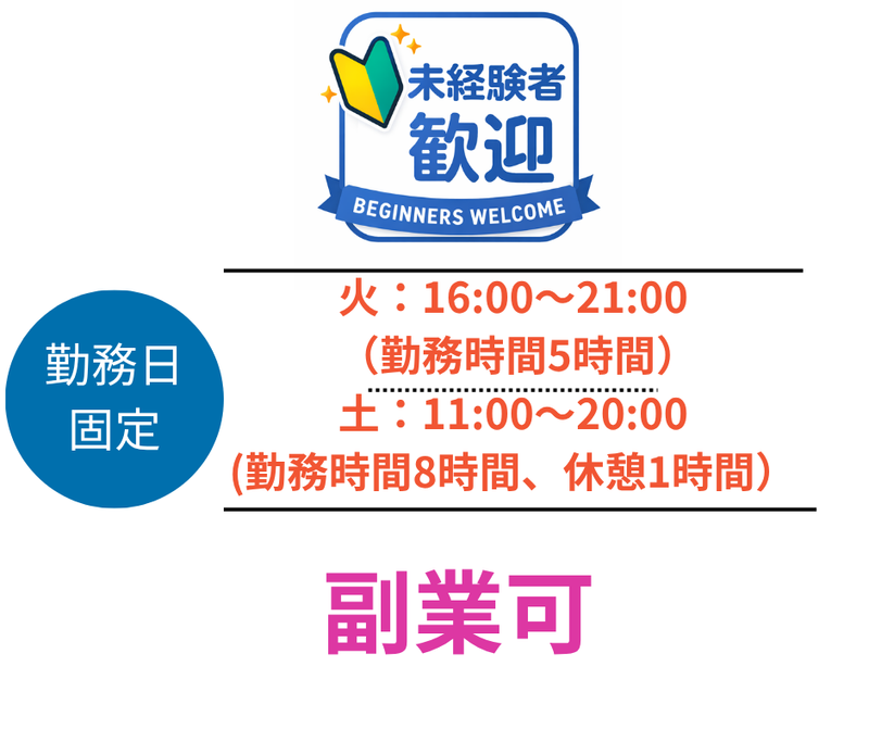 時間・勤務日詳細 勤務スケジュール: 火曜日:16:00~21:00 (勤務時間5時間) 土曜日:11:00~20:00 (勤務時間8時間、休憩1時間)