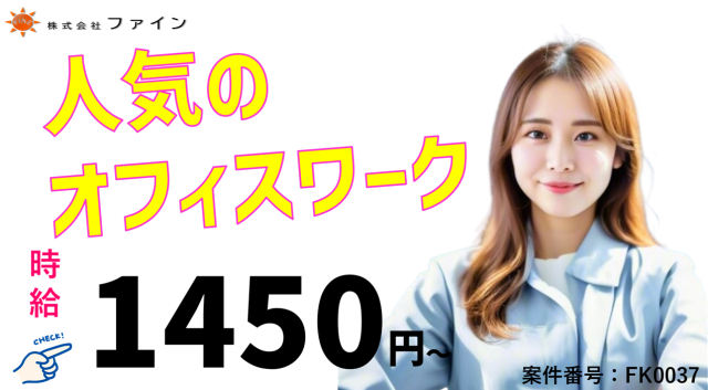 高時給1450円&フル勤務でしっかり収入!大手工場事務所内の事務スタッフ募集!入力や書類作成など ◆案件番号FK0037◆ お電話で案件番号をお伝えください♪ ・+・+・+・+・+・+・+・+ 人気のオフィスワークの 求人情報です ・+・+・+・+・+・+・+・+ ファインで働く \ おすすめポイント / ◎社員登用の実績あり →長期で安心して働きたい方にピッタリ ◎うれしい週払い制度あり(規定あり) →貯蓄にまわして旅行の積み立てや 先に支払っておきたいお金など、いろいろご活用いただいてます ◎土日祝休み(会社カレンダーあり) ◎残業代はきっちり支給です! _______________ \ ファインが選ばれる3つの理由! / ① 最短スピードでお仕事スタート! → 「すぐに働きたい!」を全力サポート ② 職場見学も同行します! →事前に雰囲気をチェックできるので安心 ③ あなたにピッタリの職場を多数ご提案! →ご応募いただいた案件以外にも、 通勤距離・収入希望額・勤務時間・ あなたの雰囲気などを 最大限に考慮して、ご提案します!