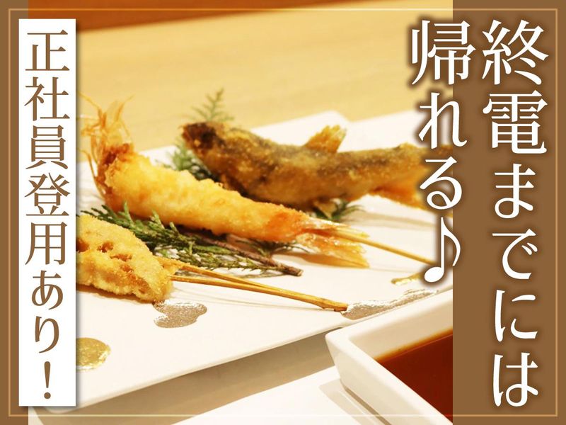 仕事内容 現在はリニューアル準備期間中の『美紗喜』ですが、営業再開に向けて、 バイトリーダー的な立ち位置をお任せできる新しいメンバーを募集中! ≪調理経験者限定≫ ≪週5日&1日7.5h勤務≫ ≪無料まかないあり!≫ ≪正社員登用あり!≫ ≪時給1500円の高収入♪≫ 【具体的なお仕事は?】 ■ホール ・お席のご案内 ・料理・飲み物のご提供 ・レジ打ち など ■キッチン ・調理業務(仕込み・調理・盛り付け) ・洗い場 など ■バイトリーダーに向けて… ・原価管理・発注業務 ・スタッフ育成 ・シフト管理 ・店舗運営全般 なども徐々にお任せしていきます! 【しっかり学べる環境】 ホテルで揚げ場を担当しているプロが調理指導のためにお店に来てくれます! 「将来的に和食・揚げ物を極めたい」と考えている方にはすごく貴重な機会です◎ 【正社員登用も積極的に!】 ゆくゆくはお店を任せられるくらいになって欲しいと思っています! 「フリーターから脱却したい…」 「チェーン店では自分の考えを通しにくい…」 など、今の状態にモヤモヤを抱えている方はぜひ飛び込んでみてください! 【和串揚げ 美紗喜について】 落ち着いた大人のお客様が通う串揚げ店。 カウンター越しに、料理の話や日常のちょっとした会話を交わしながら、 心地よい時間を共有できるのが魅力です。 人と話すことが好きな方には、特に居心地の良いお店です。