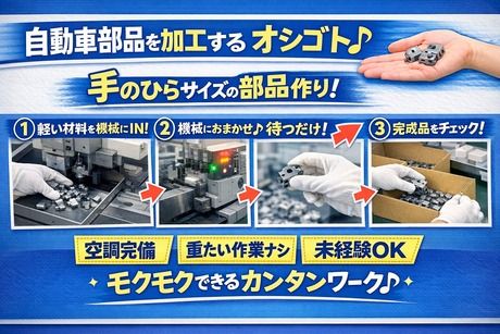仕事内容 【小牧】超かる~い♪♪プラスチック部品の組付け☆【女性スタッフ活躍中♪】 ◆◇毎回すぐ埋まる人気案件◇◆ \\今回は【先着】大募集!!// 未経験OK♪ かんたん軽作業☆ 自動車製造に使うプラスチック製品のお仕事です! ★お仕事内容★ やることはたったの【3ステップ】♪ 1 部品をセット → あとは機械におまかせ♪ 2 キズ・変形がないかチェック(^^)/ 3 OKな製品を箱に入れるだけ( *´艸`) →以上! 本当にシンプルなので、 工場デビューさんもすぐ覚えられます^^)/ ★ここがポイント★ ☆扱うのは片手で持てる軽い小物だけ♪ ☆力仕事ナシで身体の負担も少なめ☆ ☆ モクモク作業が好きな方にピッタリ◎ 20代~50代まで \\幅広い年代の女性スタッフが活躍中です☆//