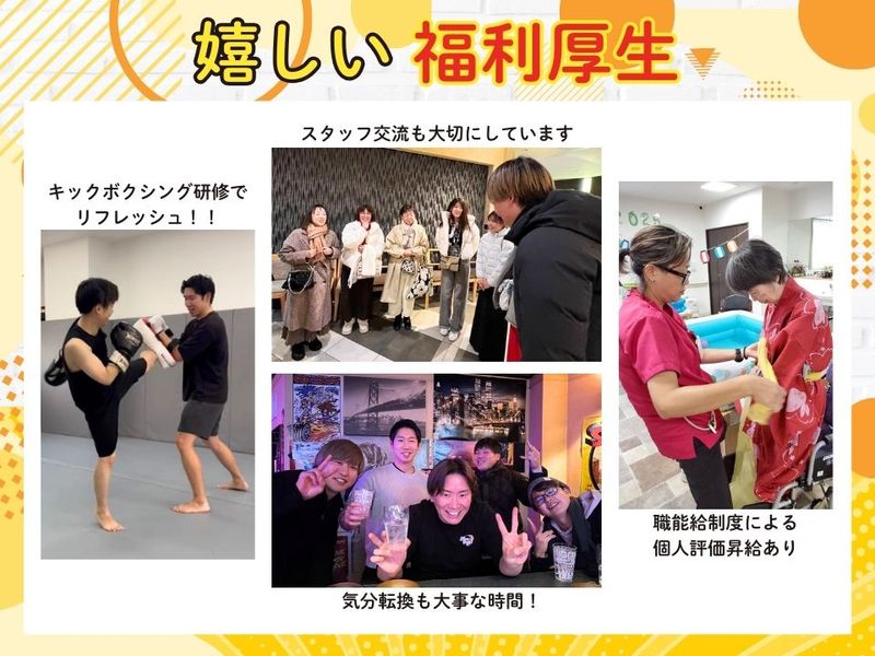 勤務時間・曜日: <日勤> 09:00~18:00 <遅出> 11:00~20:00 <夜勤> 16:30~09:30 休憩60分 休憩とは別に食事休憩30分あり ✨人員体制✨ ・役職者:1~4名 ・日中:介護4〜5名、看護師3名、セラピスト1名、事務員1名 ・夜間:介護2名、看護師1名、管理者1名 ・忙しい時も全員で協力・フォロー体制