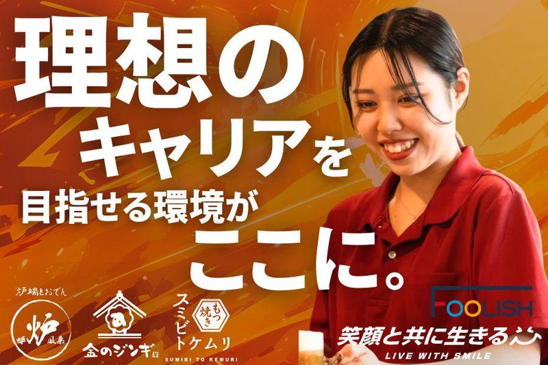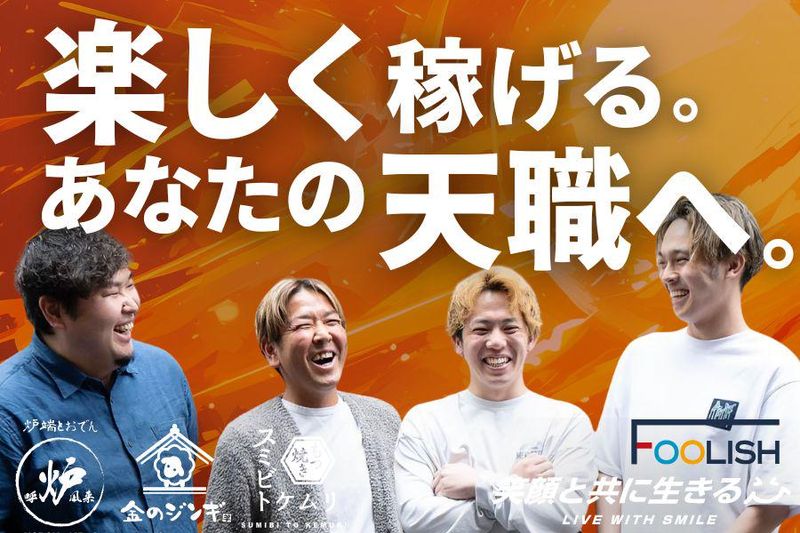 求めている人材 【応募資格】 *20歳以上の方(受動喫煙防止のため) *日本語での接客・コミュニケーションがスムーズにできる方 ※以下の条件を満たす方※ ・日本語能力検定N1レベル、または同等の会話力をお持ちの方 ・就労制限のない在留資格をお持ちの方 (永住者/日本人の配偶者等/永住者の配偶者等/定住者/特別永住者) ⭐人柄・情熱採用⭐ 学歴不問・未経験大募集! 飲食経験がある方は優遇! 即戦力として活躍したい方も必見! 《 ✨こんな方にピッタリ✨ 》 ✋とにかく稼ぎたい人! ✋仲間と青春したい人! ✋バイトの楽しさを社会人でも味わいたい! ✋勢いで人生変えたい人! ✋ベンチャーっぽいノリ、好きな人! 「やってみたい!」って言える あなたなら大歓迎♪ ===求人をご覧の皆さまへ! ✨最終面接担当よりメッセージ✨=== 「笑顔と共に生きる」 ──その想いを、これからの仲間と共に。 私たちFOOLISHは、2017年にスタートしてから、 都内中心に「呼炉凪来(ころなぎらい)」や 「スミビトケムリ」など、 流行りのトレンド居酒屋をどんどん出店してます✨ いまや全国で50店舗以上!でもまだまだ満足してません✋ “もっとたくさんの笑顔を届けたい!” ってことで、目指せ100店舗&その先へ! …というわけで、仲間を絶賛募集中⏩ お客様はもちろんのこと、 取引先様、スタッフなど、 私たちに関わるすべての人々に “たくさんの笑顔”を届けるべく、 現状に満足することなく、 さらなる成長・発展を目指しています。 ■人柄・情熱採用! 面接で聞きたいのは、 「なぜFOOLISHで働きたいのか」 「どんな未来を描いているのか」 あなたの“本気の想い”です。 研修制度やサポート体制も整っているので、 中途でもスムーズにキャッチアップ可能。 ✅スキルを最大限に活かせるポジションを用意 ✅マネジメント・ブランド開発への挑戦も歓迎 ✅独立支援制度あり(実績あり) ■ FOOLISHの考える仕事とは。 私たちにとって飲食とは、 お客さんに「幸せな時間だったな〜」って思ってもらえる場所。 その裏で、スタッフが笑って、支え合って、楽しんでる。 これぞ、FOOLISHの真骨頂。 お客さんの笑顔はもちろん、 FOOLISHのメンバー全員が “人生楽しんだもん勝ち”って思ってます✋ ■ 未来のFOOLISHを、あなたとともに。 FOOLISHは、 お客様・スタッフ・関係者みんなに 「たくさんの笑顔」を届けるべく ”100店舗出店”を本気で目指してます。 ただの“飲食業”じゃなく、 人生のドラマが生まれる“舞台”をつくるお仕事。 あなたの夢、想い、チャレンジ。 全部歓迎します。 FOOLISHは、まだまだ進化の途中。 だからこそ、経験豊富なあなたの力が必要です。 飲食の枠を超えて、 人生のドラマが生まれる“舞台”を 一緒に作っていける仲間を募集します。 理念に共感し、本気で未来を変えたい人。 次の主役は、あなたです✨ 年齢の条件と理由:あり(例外事由2号・20歳以上 (受動喫煙防止のため))