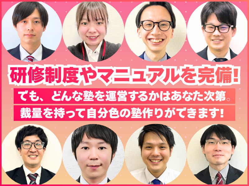 仕事内容 / 39歳以下の方を募集! \ ╭―☆――――――――╮ 未経験から6ヶ月で [教室長昇進]の実績あり! ╰――――――――☆―╯ ▼【頑張りを評価&還元】 ⏩教室利益の《20%を賞与に還元》 ⏩2年連続で《平均5%の賃上げ》 ⏩5年連続で《特別賞与支給》 ▼【安心して働ける環境】 ✅《ノルマはありません》 ✅《業務マニュアル完備》 ✅《残業月10時間以下》 ✅《フレックスタイム制》 \ \ // // ▽設立以来12期連続▽ 売上拡大中 地域No,1の教育機関へ - - - - - - - - - - - - - 2026年度中に100教室 生徒数10,000名を 目標としています•'-'•)੭ / / // \\ <仕事内容> 小・中・高校生対象 1:2~4の個別指導塾の運営業務 ■生徒への個別学習指導 ■生徒募集の活動 ■保護者様への入塾案内・定期面談 ■アルバイト講師のマネジメント ■カリキュラムの作成 等 当塾に通うのは平均点前後の 成績の方がほとんど。 ひとりひとりの課題に合わせた 指導を行っていただきます。 ⭐研修体制&業務マニュアル完備  ̄ ̄ ̄ ̄ ̄ ̄ ̄ ̄ ̄ ̄ ̄ ̄ ̄ ̄ ̄ ■入塾の案内の進め方 ■指導の進め方について ■保護者様との向き合い方 ■アルバイト講師の採用について 等 ほぼ"全業務に対するマニュアル"を用意 入社後は座学やOJTのほか、 代表による実践的な研修あり。 最短3~4週間で独り立ちが可能です。 ⭐裁量を持って行える教室づくり  ̄ ̄ ̄ ̄ ̄ ̄ ̄ ̄ ̄ ̄ ̄ ̄ ̄ ̄ ̄ 「マニュアルが多い=不自由」 という心配は不要です。 当社のマニュアルは、 利益よりも顧客を大切にするための"指針" 生徒・保護者様との向き合い方も、 授業や教室運営スタイルも 裁量を持って取り組むことができ あなたらしい教室づくりができます! ⭐顧客第一で向き合える  ̄ ̄ ̄ ̄ ̄ ̄ ̄ ̄ ̄ ̄ ̄ ̄ ̄ ̄ ̄ 塾の運営目標は自己申告制。 ノルマを設けていないため 利益を上げるための追加教材などを おすすめする必要はありません。 売上の数字に追われず、 目の前の生徒・保護者様と 真っ直ぐに向き合える体制です。 ⭐頑張りはきちんと給与に還元  ̄ ̄ ̄ ̄ ̄ ̄ ̄ ̄ ̄ ̄ ̄ ̄ ̄ ̄ ̄ ★5年連続で《特別賞与支給》 ★2年連続《平均5%の賃上げ》 ★教室利益《20%を賞与原資》として還元 未経験入社から約2年半で 年収500万円以上の社員も多数在籍中! ⭐早期キャリアアップも可能  ̄ ̄ ̄ ̄ ̄ ̄ ̄ ̄ ̄ ̄ ̄ ̄ ̄ ̄ ̄ ★入社6ヶ月で《教室責任者》就任 ★入社3年目で《エリアマネージャー》昇格 毎年度《10教室以上》を 新規開校している当社だからこそ 早期のキャリアアップを実現可能。 ブロック・エリア長への昇格も狙えます! ┏ ━━┅━━━━━━━┅━━ ┓ 【✅企業理念】 努力することの大切さを伝える ┗ ━━┅━━━━━━━┅━━ ┛ 生徒が自立して生きていけるよう 力を伸ばすことが"教育の本質"だと 考えています。 利益や点数を重視せず、 ひとりひとりの成長に 向き合うことを大切にしています。