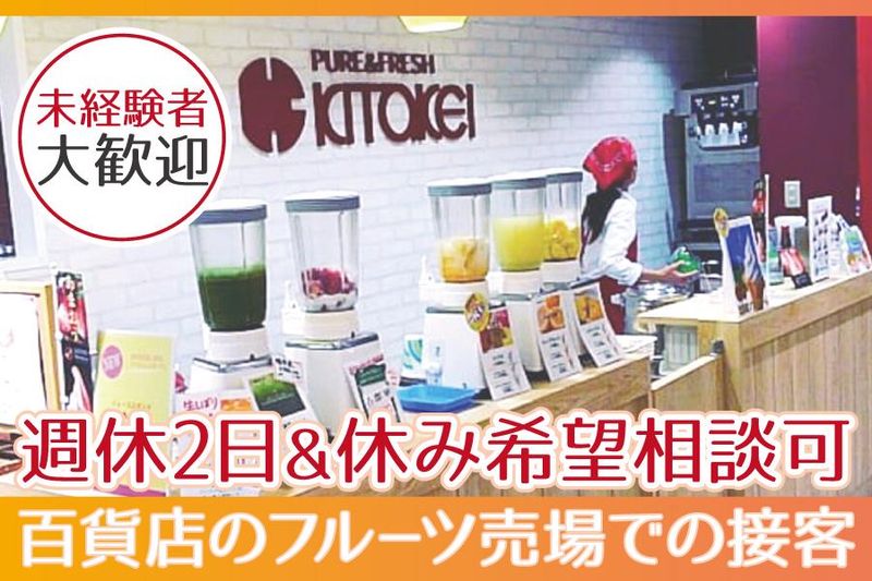 求めている人材 <スタッフ皆、未経験からのスタートです!> ・資格不要 ・未経験者歓迎 幅広い年代のスタッフ活躍中! *勤務地は百貨店内! 仕事終わりに買い物ができてとても便利です! 実際に現在活躍中のスタッフも 「帰りに晩ご飯の1品が買えたり、急に必要なものができてもすぐ買いに行けるから便利!」 と利便性抜群! 「百貨店でいろんなお客様が来るので、話すのが楽しい!」 との声多数! <下記に当てはまる方歓迎!> ・人と話すのが好きな方 ・明るく元気な対応ができる方 ・果物が好きな方 ・百貨店で働きたい方 ・接客販売の経験がある方 ・アパレルショップや食品、雑貨などの小売店で販売スタッフ、接客販売の経験がある方 ・受付や案内スタッフなどの接客業の経験がある方 ・カフェやレストラン、居酒屋などの飲食店でホールスタッフの経験がある方 ・食品などの販売、その他サービス業や接客業の経験がある方