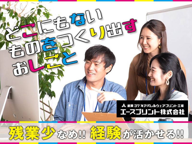 その他 どんな仕事内容? 生産管理 【お仕事内容】 プリント加工会社で生産管理・倉庫内作業をお願い致します 具体的には・・・ ・受発注の確認 ・入荷してきた無地のTシャツ仕分け作業 ・発注書通りにきちんと入っているか、サイズが合っているかを確認 ・出荷作業 ・お客様からの問い合わせ対応等 ・人員手配 ・資材の管理 ≪入社後の流れ≫ 入社後1~3ヶ月くらいは先輩のサポートからはじめていきましょう。 少しずつ仕事を覚えていってください。 みんなでしっかりとバックアップしていきますので、 分からないことがあれば何でも聞いてください。 ~1日の仕事の流れ~ まずは発注書の確認 次に入荷してきた無地のTシャツ仕分け作業 発注書通りにきちんと入っているか、サイズが合っているか プリント加工が終われば、内職の人に袋詰作業をしてもらう 出荷作業 エースプリントのこだわり 衣類のデジタル化が進んでいるなか、 あえて手作業でプリントするのは、 手作業でしかできないデザイン等があるため どんなお客様の要望にも応えれることができます。 色を作るところから始めるのですが、 プリントする生地によって同じ青でも色味を変えたり、 グラデーションを作ったり等、毎日プリントする柄が違うので、 楽しみながら作業をしています♪ お仕事No:生産管理/正社員 許可番号(人材派遣等): null