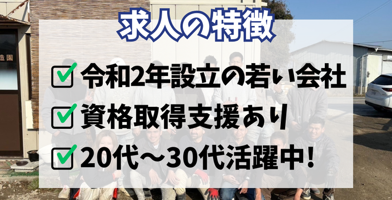 仕事の内容 \未経験から正社員へ!/ 当社は、学歴や職歴よりも、「これからどうなりたいか」を大切にする会社です。 未経験から始めて、今では家族を支える存在になった先輩もいます。 【月給25.9万~32.4万円スタート(月平均21.6日稼働)】 ■賞与年2回+決算賞与あり ■学歴や国籍は問いません!中卒・外国籍のスタッフも活躍中 ■チームワーク重視!2020年の設立からスタッフ定着率は100%◎ ■現場終了は遅くとも18時まで(基本直帰) 設立7年目の若い会社です! 仕事はキッチリ、雰囲気は和気あいあい。 気の合う仲間と楽しく働ける会社です! 「稼げるようになりたい」 「家族に胸を張れるようになりたい」 今からでも遅くない。 本気で変わりたいあなたを、私たちが支えます。 ・-・-・-・-・-・-・-・-・-・ 【業務内容】 植物や石、ブロックなどを使って、家の外回りをデザインする外構工事の仕事です。 施工するのは、兵庫県内のオシャレな建売住宅やアパートの外構。 『誰かの大事な住まい』を手がけるやりがいがあります! ・重機を使った庭の造成 ・軽ダンプでの資材運搬 ・フェンス、門柱、庭石などの設置 など ※1日5~6班に分かれて各現場を担当 ※作業エリアは主に兵庫県内(姫路、小野、明石、神戸など) ※資材の積み込みは、前日夜 or 当日朝など希望に応じて調整可能! <入社後の流れ> まずは、先輩のサポートからスタート! 道具の名前や使い方は一から教えます。 未経験から1ヶ月で、ブロック積みやタイル貼りの基礎が身についた先輩も多数! ・-・-・-・-・-・-・-・-・-・ 【働くスタッフの声】 気づけば入社して5年。 最初は何もわからず、ただ毎日がむしゃらに働いていましたが、だんだん社長の人柄や仕事への本気さに触れて、「この人のもとで頑張ってみよう」と思うようになりました。 仲間と一緒に現場を完成させて、お客さんに「ありがとう」って言ってもらえるのが、やっぱり一番うれしいです。 こんなあなたにピッタリ!  ̄ ̄ ̄ ̄ ̄ ̄ ̄ ̄ ̄ ̄ ̄ ̄ ̄ ● 身体を動かす仕事がしたい ● チームで働くのが好き ● モノづくり・DIYが好き ● 外で働くのが気持ちいいと感じる ● 庭師や職人の世界にあこがれがある ● 手に職をつけて安定したい ● 家族に自慢できる仕事がしたい 未経験でも、知識がなくても構いません。 毎日決まった時間に現場へ行き、一つひとつ覚えていく。 それができれば十分です。 「家族を守れる人になりたい」 その覚悟があるなら、私たちは全力で育てます。 逃げずに、投げ出さずに、続ける。 その先に、安定した収入と自信を持てる自分が必ず待っています。 ぜひお気軽にご応募ください! 気になることがあれば、お問い合わせだけでもOKです◎
