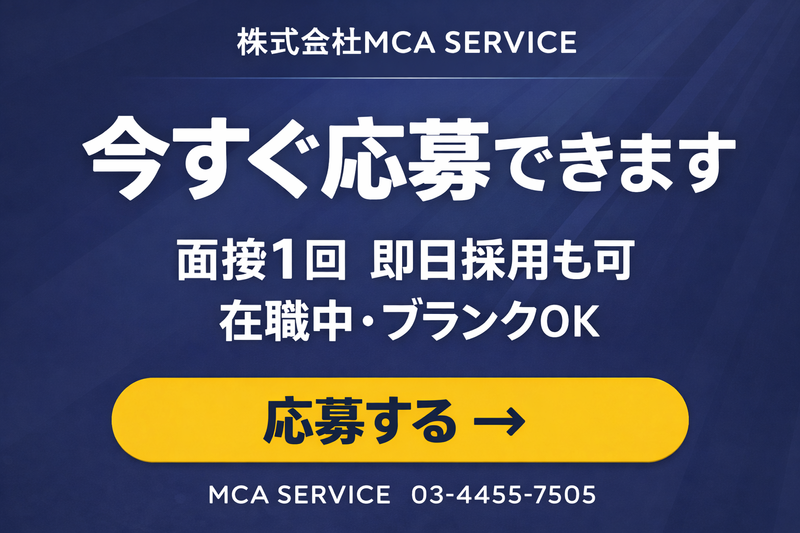 求める人材: <<前職・経験は一切問いません!>> MCA SERVICEでは、バックグラウンドよりも「人と丁寧に関わりたい」という気持ちを重視しています。これまでに入社したスタッフの中には、次のような方が多くいます。 ・ 飲食・カフェ・居酒屋スタッフから転職した方 ・ 販売・接客業でコミュニケーション力を磨いてきた方 ・ 事務・データ入力のアルバイト経験がある方 ・ 工場・倉庫など黙々と作業してきたが、人と話す仕事に挑戦したい方 ・ Wワーク・副業として収入を増やしたい方 ・ 就職・転職活動中で、まずはアルバイトから始めたい方 ・ 育児・家事と両立しながら、自分のペースで働きたい主婦(夫)の方 ・ 土日に積極的に働きたい方(優遇あり) もちろん、コールセンター経験者も大歓迎。即戦力として活躍できる環境が整っています。 【必須条件】 ・ 18歳以上の方 ・ 週3日以上出勤できる方 ・ 基本的なPC入力ができる方(タイピング初心者でも研修あり) 「志望動機はなんとなく」で大丈夫です。「なんか良さそう」「シフトが合う」「時給が高い」——そんな気軽な理由でも、ぜひ一度話を聞きに来てください。 あなたの「知りたい」に答えます 『コールセンターって、本当に未経験でも大丈夫?』 大丈夫です。MCA SERVICEでは、完全スクリプト・マニュアルを用意しているため、入社初日から「何を言えばいいかわからない」という状況にはなりません。先輩スタッフも未経験からスタートした方が多く、丁寧にフォローする文化が根付いています。 難しいクレームはSVが対応します。あなたが一人で困ることがないよう、チーム全体でサポートします。