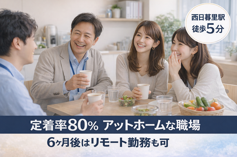 アクセス: 「通勤は短くしたい」「都内でアクセスが良い職場を探している」——そんな方に最適なロケーションです。 《東京都荒川区西日暮里》 ・ JR山手線・京浜東北線「西日暮里」駅 徒歩5分 ・ JR常磐線「日暮里」駅 徒歩5分 ・ 東京メトロ千代田線「西日暮里」駅 徒歩5分 ・ 日暮里・舎人ライナー「西日暮里」駅 徒歩5分 4路線利用可能で、都内各方面からアクセス抜群。通勤交通費は上限25,000円まで支給されます。 ★ 研修6ヶ月後は在宅リモート勤務も選択可能 ★