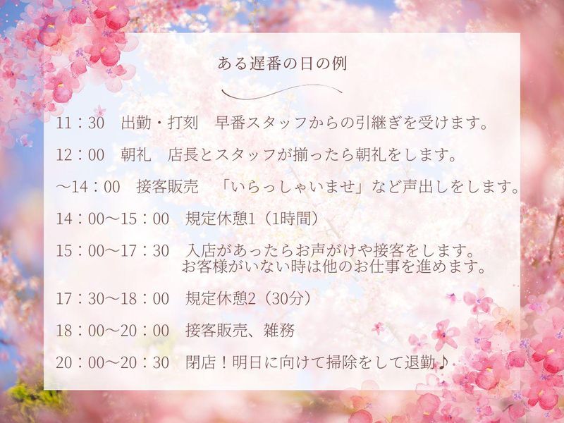 勤務時間詳細 ◎好きなシフトを選んでOK! 朝が苦手な方、バスの時間までに帰りたい方、決まった生活リズムが好きな方などご希望をお伺いします。 09:30~20:30のうちで希望制 ※短時間の慣らし勤務OK 【1日最大7.5時間で勤務する場合】 早番シフト 09:30~18:30 遅番シフト 11:30~20:30 【ある1日の流れ(遅番勤務の場合)】 負荷を感じたら5~10分程度の休憩を! 無理せず作業をしていきましょう。 11:30 出勤・打刻 早番スタッフからの引継ぎを受けます。 12:00 朝礼 店長とスタッフが揃ったら朝礼をします。 ~14:00 接客販売 お客様が入店されるのを待ちます。 「いらっしゃいませ」など声出しをします。 14:00~15:00 規定休憩1(1時間) 15:00~17:30 接客販売、雑務 入店があったらお声がけや接客をします。 お客様がいない時は他のお仕事を進めます。 17:30~18:00 規定休憩2(30分) 18:00~20:00 接客販売、雑務 20:00~20:30 閉店!明日に向けて掃除をして退勤♪ 契約更新期間:3ヶ月