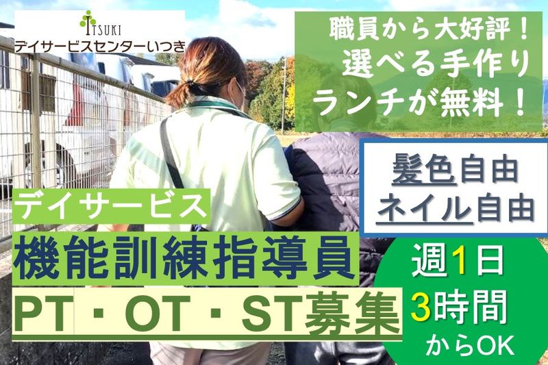 【仕事内容】 1日体験を実施しています!もちろん給料もお支払いします! どんな施設なのか、どんな働き方か、1日体験してみませんか?(半日体験も可能です) ✅同法人内の複数施設で勤務をしたい方も大歓迎! 一緒に地域のリハビリ環境をより良くしていきましょう! 【アピールポイント】 ・年齢不問 ・未経験OK ・ブランクOK ・週1日からOK ・なんと昼食無料 ・髪型、髪色自由 ・副業、WワークOK ・育休明けの職員多数在籍 ・体験入社制度あり(給与支給) ・キャリアアップ実績多数あり ・ネイルやアクセサリーOK(業務に支障のない範囲) ・有給休暇は1時間単位で申請可能 ■具体的な仕事内容 ・機能訓練計画書の作成 ・機能訓練の実施 ・日々の訓練実施の記録 ・送迎/受け入れ ・レクリエーションの企画・運営 など ※資格はあるけれど、実務経験が少ない方やブランクがある方もご安心ください! ■当社について 『ご利用者様の最高の笑顔を導く為に!』 一般的な介護業務をしながら、既存の介護モデルに縛られることなく、自身が実現したいサービスやレクリエーションの実施が可能な介護施設です。 ■ご利用者様からのご意見を反映したイベント事例 ・伊勢神宮参り ・周年祭時のまぐろの解体ショー ・社長秘伝のタレを使用した鰻の蒲焼祭 など 会社を立ち上げ今年で10年目となりますが、ご利用者様の笑顔を導く為に様々なイベントやレクリエーションを実施して参りました。 ご利用者様と職員によるコラボレーション企画や、職員の発案により、お誕生日にサプライズイベントとしてZoomを利用してのお誕生日会等も行っております。 もし自分が介護施設を経営するなら、あなたはどんな施設にしたいですか? 株式会社樹から三重県の介護業界を盛り上げ、更には日本全土に我々が企業理念として掲げる「五つの気」を通した「介護」が広がることを心より願っております。 ■こんな方大歓迎 ・人と接することが好きな方 ・笑顔溢れる職場で働きたい方 ・「介護」を通じてやりたいことがある方 ・仕事を通じて社会貢献をしたい方 ■各SNSで発信中! 社長の想いや施設での取り組み(イベント・機能訓練・食事など)について発信をしています! <YouTube>「ほっとけやんチャンネル」 <Instagram・TikTok>「デイサービスセンターいつき」 で検索してみてください! 【求人ID-IKK】
