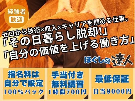 仕事内容 ■経験を活かしてしっかり稼げる職場!「前職より収入が上がった」の声多数! ーリラクゼーション経験者のあなたへー 「件数が少なくて思ったより稼げない…」 「経験があるのに十分に活かせていない…」 こんなお悩みをお持ちの方は是非一度ご応募ください! 【当店で働くメリット多数!】 ■指名料は自分で設定OK&100%バック! ■施術単価 60分2,020円~2,700円!高水準! ■経験を活かせる自由シフト&ノルマなし! ■高稼働日には8件以上の施術実績も! ■WワークOK!ノルマなし!髪型自由! ■最低保証あり ■地下鉄「成増駅」より徒歩0分の好立地 【仕事内容】 お客様の不調をヒアリングして、 全身ほぐし施術(マッサージ)を行うお仕事です。 新メニューとして、頭ほぐしや足ほぐしも展開中! 【具体的には…】 ・カウンセリング:お客様の体の状態や悩みをヒアリング ・施術:指圧・ストレッチ・マッサージなどを用いた施術 ・アフターケア:施術後のアドバイスやストレッチ指導 その他付随業務として、接客、受付、ご案内もお願いします! 【1日の平均施術件数】 平日4~6件 土日6~8件 建物は駅前に面しているため、 お客様の動きも多く集客力が高い店舗です。 しっかりと施術に入れる環境の為、月収30万以上も可能! 最初は勤務数は少なめに設定して、 いずれは長く続けたい方にもオススメです◎ ノルマ・営業トークもなく、 人間関係のストレスがない環境です! 【無料の技術講習あり!(1h700円の手当あり)】入社後も成長可能!充実のサポート体制 入社してからも更に活躍できるように 充実したサポート体制をご用意しております! 丁寧なマンツーマン研修で、 スクールで数十万円かかる手技を無料で学べます! 【例えば……】 ・技術や接客スキルを基礎から丁寧に指導します ・経験豊富なスタッフの下で、 実践を通してスキルアップをサポートします! ・専門知識や整体技術を身につけられるので 働きながら学べる環境! 【現在働かれている方をご紹介】 ●子育ても頑張るママAさん(30代) 「接客の経験を活かして『癒し』を提供したいと思い挑戦しました。 マッサー ジや整体の基礎が身につくので、家族にも喜ばれますよ」 ●本格的にスキルを学びたいBさん/30代 「失業中だったのでとにかく手に職を付けたいの一心で始めました。 オーナーが親身にゼロから教えてくれたので、 どんどん自信がつきました!」 生活サイクルに合わせた働き方が可能! 「週3~4日で働きたい」「勉強しながら働きたい」と お考えのプライベート重視派の方や、 「週5フルタイムでレギュラーワークがしたい」 「資格を活かして仕事がしたい」とお考えの収入重視派の方など 生活サイクルに合わせて勤務していただけます! 休憩時間は一時帰宅も可能です! 【スタッフインタビュー】 Q:1日にどのくらい施術をしていますか? A: 施術時間は1日平均6~7.5時間ほど実施します。 インターバル(施術の合間)は10分間隔で 休憩などは予約状況を見て、自分のタイミングで取っています。 Q:この業界に入った理由はなんですか? A:元々別業界で会社員として働いていた未経験者ですが、 学生時代からリラクゼーション業界にも興味がありました。 前職を退職したタイミングで挑戦してみようと思い、 家から近い成増店の求人を見て応募しました。 Q:どんな人が働いていますか? A:私のような元会社員もいれば、 柔道整復師の資格をお持ちの方、 芸人、フリーター、役者などもいらっしゃいます。 Q:この店舗の魅力はなんですか? A: 1つ目は、安定して施術に入れる環境です。 駅チカでアクセスが良く、 平日でも満床になることが多いため、 土日も含めてしっかり稼げますし、技術も磨けます。 2つ目は、未経験でも安心して活躍できる体制が整っていることです。 経験豊富な先輩が丁寧にサポートしてくれますし、 研修後にいきなり新規対応!ということはなく、 先輩達が1日4本程度で予約調整をしてくれます。 最初は20分のインターバルで設定しています。 技術は身につけば一生もの それを無料で教えてもらうっていいですよね♪ 3つ目は、新しい技術も学べる環境がある点です。 去年からアロマオイルを使った足ほぐしプランやオイルを使わないヘッドスパ=頭ほぐしプランを導入。 お客様にも大好評で嬉しい声も多くいただいております。 リピーターも多く給与もスキルも高めることができます。 \アルバイトより自由で、しっかり稼げる!/業務委託ってどんな働き方? 「業務委託って、むずかしそう…」 「アルバイトとどう違うの?」 業務委託と聞くとそんな疑問を持つ方も多いと思います。 実は,お店と“雇用契約”ではなく“仕事の契約”を結ぶ、 自由度の高い働き方なんです♪ たとえば… 「カフェでバイトする」のではなく、 「お店を借りて営業する」ようなスタイル。 とはいえ、お客様も場所も、お店がすべて用意済み! なので、 ◆自分のペースで働ける ◆でも一人きりじゃない という“いいとこどり”な働き方ができます◎ ■ 業務委託のメリット