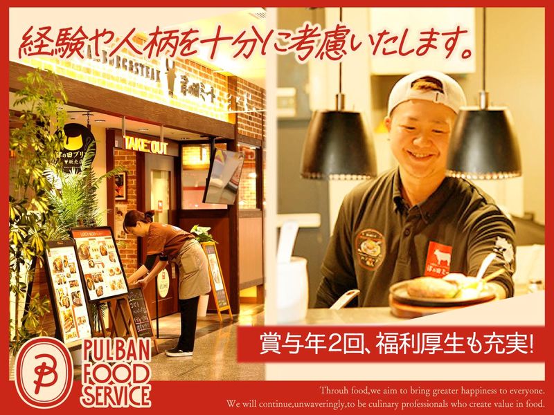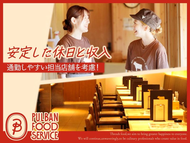 仕事内容 【公式コーポレートサイトも是非ご覧ください】 当社の「理念」「雰囲気」「取り組み」「スタッフの入社経緯」など、 こちらの求人詳細だけではご紹介しきれない内容も知って頂けるようになっております。 写真、動画も豊富にアップしており、代表のメッセージ動画などもご覧頂けます。 こちらの求人詳細と併せて、 ホームページの仕事シーンや、スタッフ紹介も見て頂く事で、 当社の事をよりイメージして頂き、ご興味頂いた方は是非ご応募ください。 下記URLや検索などからぜひチェックしてみてください! 『理念/仕事シーンの写真』 https://pulban.co.jp/about-us/ 『独自の福利厚生/社長メッセージ』 https://pulban.co.jp/recruit/ 『スタッフ紹介』 https://pulban.co.jp/staff/ 『法人向けお弁当の宅配』『オリジナルケーキ』『キッチンカー』など、 新しい取り組みを積極的に行っております。 是非、コチラもご覧ください。 https://pulban.co.jp/journal/ 【仕事内容】 ◆接客、調理業務 ◆アルバイト・パートスタッフの採用、教育、シフト作成や管理 ◆食材の発注、在庫管理 など まずはホール・キッチン業務から担当して頂きます。 肉汁溢れるこだわりぬいたハンバーグ作りを学んで頂きます。 ひと通りの店舗業務を覚えたら、店長の補佐役としてリーダーを担って頂きます。 お客様やスタッフから愛され、必要とされ続ける良いお店を共に作っていきましょう。 【津の田ブランド・3種類を展開中】 ~大衆洋食・ハンバーグレストラン「津の田ミート」~ ~ホテルカレーを大衆に「TsunodaCurry」~ ~和牛肉丼と韓なべ「ツノダシクタン」~ 【担当店舗】 ★阪神・神戸エリア(尼崎つかしん、アステ川西、甲子園、Liv住吉、プレンティ西神中央) ・津の田ミート つかしん本店 ・津の田ミート アステ川西店 ・津の田ミート 甲子園プラス店 ・津の田ミート Liv住吉店 ・津の田ミート 西神中央店 ・TsunodaCurry 甲子園プラス店 ・TsunodaCurry Liv住吉店 ・ツノダシクタン つかしん店 ・ツノダシクタン アステ川西店 ★全店舗に携わって頂ける方は『ナショナル社員』としての雇用になります。 (◎給与ランク査定に加点いたします) <大阪エリア> ・津の田ミート 茨木店 ・津の田ミート エミル高槻店 ・津の田ミート ロッジ高槻摂津峡店 ・津の田ミート 吹田山田店 ・TsunodaCurry エミル高槻店 ・TsunodaCurry 茨木店 【1日のスケジュール例】 ・10:00…出社/開店準備 ・11:00~15:00…OPEN/営業・仕込み ・15:00~17:00…休憩 ・17:00~21:00…営業/仕込み ・21:00…ラストオーダー・片付け ・21:30…閉店 ・21:30~22:00…退社 業務時間内は、店長や社員の指示のもと業務を行っていきますが、 慣れてきましたら、自分たちの裁量で進めて頂く事ができます。 日々の状況により変動がございますが、 休憩時間も取りやすく、無理のない勤務時間で、 安心して働いて頂ける体制です。 【定年まで、定年後も活躍しやすい体制】 現在、店舗社員は40代後半、50代、60代の社員も活躍中! 店舗業務を務め上げた将来には、セカンドキャリアとして「肉卸事業部」への転換も相談可能です。 安心して働いて頂けるよう無理な店舗異動は行わず、通勤面を考慮した配置・異動を行っております。 培ってきたビジネスマナーやスキルを、20代、30代のスタッフへ伝えていく役割にも期待しております。 お客様層は「ファミリー」「ビジネス」「ご夫婦」などの方々を中心にご来店頂いております。 ご経験されてきた心配りや接客などを存分に発揮して頂ける環境ですので、 「飲食に関わっていきたい」という想いをお持ちの方は、是非ご応募ください。