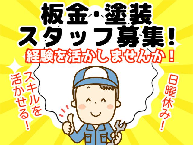 仕事内容 <正社員募集> 自動車の鈑金・塗装のお仕事です! 当社では、社員の意思を尊重しますので 気持ちよく仕事ができますよ。 <当社のオススメポイント> ・休憩室あり ・顧客対応は一切なし ・とことん目の前の車に向き合える ・まるでショールームのような工場 ・30代~40代の社員がメイン ・日曜は完全に休み <お仕事について> 整備工場において、鈑金から 塗装までお任せします。 顧客対応は専任スタッフが行いますので 安心して働けます! ・鈑金加工 車の傷やへこみ、事故などで 曲がってしまったフレームを 加工して修理します。 どれだけ大破している状態でも、 修理できる技術力が当社にはあります。 ・塗装 鈑金加工が終わったら、塗装を行ないます。 塗装内容は小さな傷を隠す程度の 狭い範囲から、車体全体など広い範囲に わたるものまで様々です。 <仕事の特徴> 当社は国産各メーカーの指定工場、 各保険会社の取扱代理店となっております。 さまざまなメーカーの多岐にわたる 車を扱いますので勉強になりますよ。 国産から外車まで扱っているため、 経験を積む中で仕事のコツをつかめます。 鈑金・塗装は1ヵ月80~100台の車を 6名のスタッフで対応しています。 <こんな方にオススメ> ・車の修理がしたくても他の仕事を頼まれて なかなかできない ・効率化UPや生産性重視ではなく、 クオリティにこだわりたい。 ・日曜日は家族のこともあるので休みたい。 <応募の流れ> ・STEP1 まずはWEB応募もしくはお電話で応募受付 面接日のご相談 ・STEP2 会社見学・面接 入社前に一度は会社をしっかりと見ていただきます! ・STEP3 内定などのご連絡 面接後できる限り早く結果を ご連絡いたします。入社日はご相談に応じます。 在職中の方もご相談ください。 正社員として安定して働きたい方、 好きな事を活かして働きたい方、 ご応募お待ちしております。