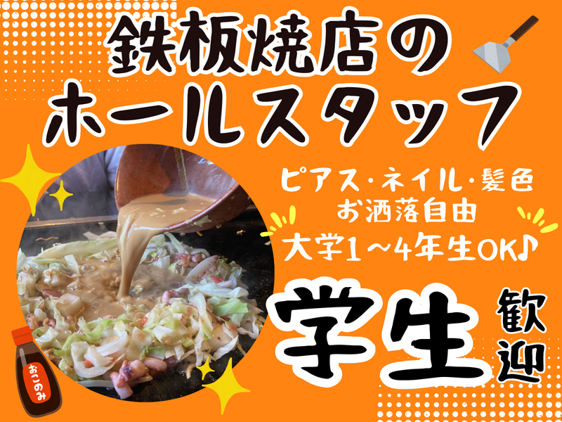 仕事内容 \✨学生に嬉しい!メリットは3つ!大学3・4年生歓迎!✨/ ✅お洒落自由♪ネイル・ピアス・髭・髪色自由! ✅給与現金支給!食費節約!大将特製の絶品まかないあり! ✅シフト自由!希望があれば調整★ <鉄板焼き店のホールスタッフ大募集!> お任せすることは・・・ ❖お客様のご案内 ❖注文取り ❖ドリンク作り ❖料理・ドリンクの提供 お仕事はカンタンです◎ 飲食店でのバイト経験ある方優遇! 経験があればスグに覚えられますよ♪ ⭐ネイル・ピアス・髭・髪色・髪型自由⭐  ̄ ̄ ̄ ̄ ̄ ̄ ̄ ̄ ̄ ̄ ̄ ̄ ̄ ̄ ̄ ̄ ̄ ̄ ̄ ̄ 常連さんが9割のお店で、雰囲気はアットホーム◎ オシャレは全部自由! 好きなスタイルでオシャレしてください☆ ⭐給与現金支給!食費を気にせず安心!美味しいまかないあり⭐  ̄ ̄ ̄ ̄ ̄ ̄ ̄ ̄ ̄ ̄ ̄ ̄ ̄ ̄ ̄ ̄ ̄ ̄ ̄ ̄ リクエストしたら、大将がいろいろ作ってくれます♪ しかも、まかないを食べる時間も時給発生! バイトを頑張った後は、絶品まかないを味わってください! ⭐学業・プライベート優先OK!⭐  ̄ ̄ ̄ ̄ ̄ ̄ ̄ ̄ ̄ ̄ ̄ ̄ ̄ ̄ ̄ ̄ ̄ ̄ ̄ ̄ 1日4時間~OK! 「平日のみ」「土日休み」「土日のみ」「ガッツリフルタイム」などOK! シフトの融通はきくので、勤務日数・曜日はご希望を教えてくださいね◎ ・大学生大歓迎! ・Wワーク・かけもち・副業OK ・扶養内勤務OK