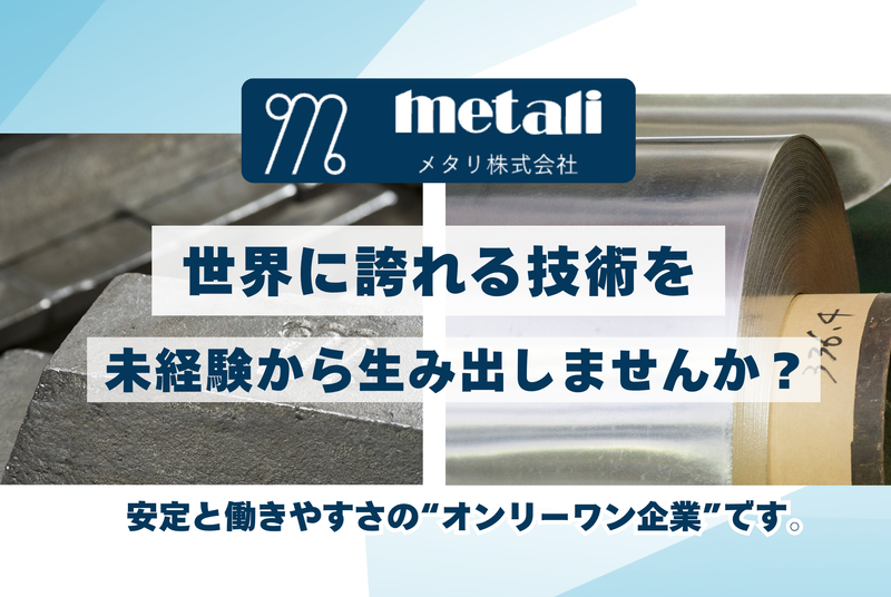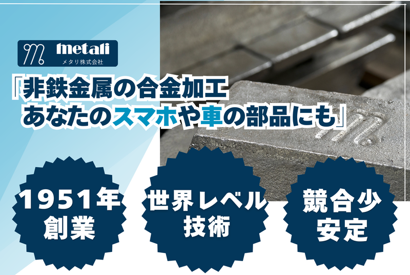 仕事内容 \非鉄金属の合金製造・超薄膜加工/ ⏩合金製造(複数の金属を配合) ⏩圧延機を使った金属の伸ばし加工 ⏩最小5ミクロンの超薄膜加工技術の習得 世界トップレベルの技術を一から身につけられます。 ▼簡単な募集内容▼ 【雇用形態】正社員 【給与】年収:310万円~500万円 【勤務時間】8:30~17:30 【勤務地】京都府八幡市戸津水戸城31-1 【募集要件】未経験歓迎♬学歴不問 ★この求人のアピールポイント★ ✅️年間休日127日!土日祝休みでプライベート充実 ✅️残業ほぼなし(月10時間未満)で働きやすい ✅️世界で2社のみの技術を習得できるレア求人 ✅️10年以上で退職者ほぼゼロの高定着率 ✅️無借金経営×大手企業取引で安定性抜群 ==================== 【どんな会社?】 1951年創業、70年以上の歴史を持つ非鉄金属の合金加工メーカーです。錫・鉛・銅など様々な金属を扱い、インゴット・粒・箔製品へ加工しています。特に「5~7ミクロン」という超薄膜の箔製造技術は世界でも限られた企業しか持たない高度技術。スマートフォン、バッテリー、自動車、釣具など、身近な製品に幅広く使われています。大手企業を含む150社以上と取引があり、無借金経営を継続。安定性と働きやすさを兼ね備えた“オンリーワン企業”です。 ==================== 【お仕事内容】 非鉄金属の合金製造から、圧延・加工まで一貫して担当します。 具体的には ⏩金属の配合・合金製造 ⏩圧延機で金属をロール状へ加工(約1.5mm) ⏩精密圧延で最小5ミクロンまで加工 ⏩スリッターでカット加工 ⏩品質チェック・検査業務 あなたが作った素材が、スマホや車などに使われるやりがいある仕事です。 《入社後の流れ》 まずは安全教育+先輩のアシスタント業務からスタート。金属の基礎や機械操作を一つずつ学びます。未経験スタートの社員も多く、携帯販売・倉庫・飲食など異業種からの転職者が活躍中です。 段階的にスキルを身につけ、将来的にはリーダーや管理職へのキャリアアップも可能です。 【会社の魅力】 ✅️年間休日127日&完全週休2日制 ✅️残業ほぼなしでワークライフバランス◎ ✅️世界レベルの技術を未経験から習得 ✅️競合が少なく安定した受注基盤 ✅️昇給3~4%+賞与年2回+決算賞与(6年連続) 働きやすさと安定性、そして技術力の高さが揃った環境です。