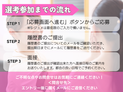 選考プロセス ①ご応募 ▼ ②履歴書のご提出 ▼ ③一次面接(WEB) ▼ ④最終面接(対面) ▼ 内定 ※状況により変更となる場合がございます