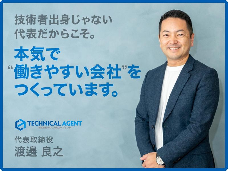選考プロセス エントリー ▼ 書類選考 ※通過された方に 面接日などのご連絡をいたします。 ▼ 面接(WEB面接可能) ※面接日時はご希望を考慮いたします。 あなたのご都合に合わせます。 ◎仕事のこと、会社のこと、 何でも遠慮なく聞いてください。 面接はお見合いの場だと思っています。 あなたも当社を 面接するつもりでお越しください。 ▼ 内定 ※入社日は相談に応じます。 【HP】 https://technical-agent.jp/