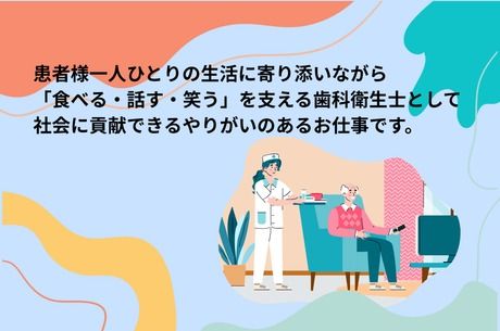 資格 【必須】 歯科衛生士資格 ★年齢不問・訪問歯科未経験OK・ブランクOK 【優遇】 自動車免許 ☆施設訪問時運転可能な方は給与優遇あり