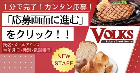 その他 未経験OK、高校生応援、大学生歓迎、フリーター歓迎、主婦・主夫歓迎、シニア活躍中、短時間OK、長期歓迎、平日のみOK、土日祝のみOK、週1、2日からOK、週3日以内OK、週4日以上OK、シフト制、昇給あり、交通費支給、まかない付き、社員登用あり、制服あり、車・バイク通勤OK、履歴書不要 【ブランド名】 フォルクス 【事業内容】 ステーキ&ベーカリーレストラン