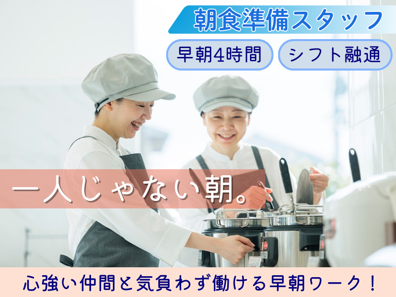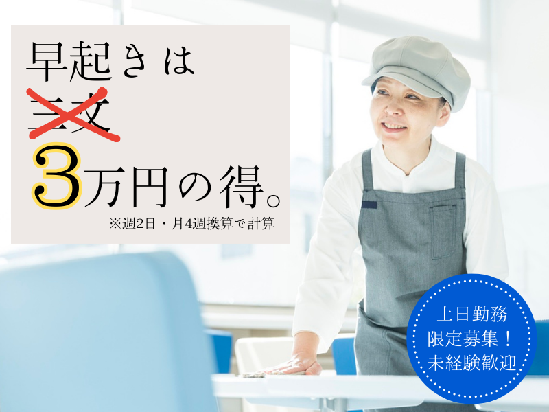 固定時間制 勤務時間詳細 \土日限定*朝だけスタッフ募集/ ⏰ 勤務時間 5:30~9:30(実働4時間)  ̄ ̄ ̄ ̄ ̄ ̄ ̄ ̄ ̄ ̄ ̄ ̄ ̄ ̄ ̄ ̄ ̄ ̄ ̄ ̄ 残業はほぼなし。 お仕事は午前中で終了するので── ● 帰宅してゆっくりするもよし ● そのまま予定を入れるもよし 土日の時間を、ムリなく有効活用できます♪ ✨ 土日どちらか週1日~勤務OK!  ̄ ̄ ̄ ̄ ̄ ̄ ̄ ̄ ̄ ̄ ̄ ̄ ̄ ̄ ̄ ̄ 土曜のみ/日曜のみ/土日両日いずれもOK! ライフスタイルに合わせて、 無理のないペースで働けます。 シフトの相談も柔軟に対応します◎ ✨※月1ミーティング(9:00~)有り