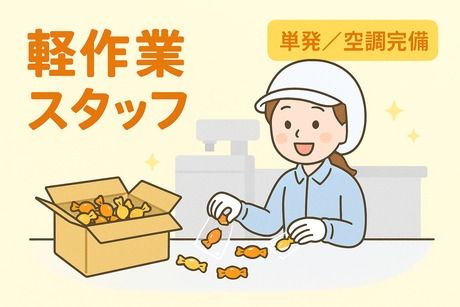 仕事内容 【仕事内容】 \単発OK!お菓子の軽作業スタッフ募集!/ クッキーなどのお菓子を ・袋に入れる ・段ボールを組み立てる など、とってもカンタンな軽作業が中心♪ 重いものは一切なし!未経験の方も安心です! ★ここがポイント!★ 単発OK!長期歓迎!週2日~勤務可能 20~50代の女性スタッフが多数活躍中 空調完備で一年中快適な職場環境 週払い対応可 【アピールポイント】 20代~50代女性活躍 空調完備 単発 長期歓迎 副業・WワークOK ブランクOK 未経験・初心者OK 重い物なし 車通勤OK 週払いOK 【勤務地の補足】 埼玉県上尾市領家
