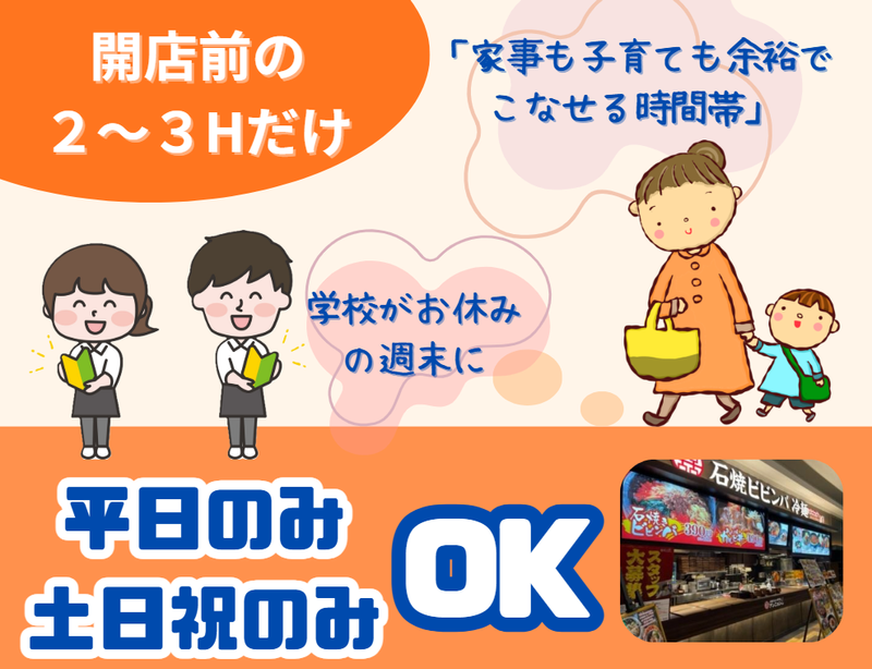 仕事内容 開店前の準備のお仕事です。 お客様が来店する前だから 自分のペースで黙々&コツコツ 働くことが好きな 方にもおすすめのお仕事◎ 材料の準備や簡単な仕込み、 ホール内の清掃など、 難しい作業はありませんので 安心下さい。 ★働きたくても 時間に制限が… 収入に制限が… 部活・サークルが… なんて方もまず注目下さい。 「学業応援シフト」 「Wワーク応援シフト」 「子育て応援シフト」 であなたの働き方をサポートします◎ ✅シフト自由 ・週1日~、1日2~3hでOK …学生&主婦(夫)歓迎! 高校生・大学生も多数活躍中! ・週末のみOK ・平日のみOK ✅1~3か月くらいの短期勤務も大歓迎! ✅春・夏・冬休み・GWなどの長期休みの たびにスポット(単発)バイトもOK! 帰省中にバイトしてしっかり稼いでる 学生さんもいます◎ ✅旅行や行事などで1度も入れない週が あってもシフト調整するから大丈夫ですよ◎ ✅お子様の春・夏・冬休みやGWなど 家において働きにいけない・・・ という方も安心下さい。 お子様の長期休み期間中は 一緒にお休みもOKです◎ ✅お子様の急な発熱等でのお休みも 臨機応変に対応します。  ̄ ̄ ̄ ̄ ̄ ̄ ̄ ̄ ̄ ̄ ̄ ̄ ̄ ̄ ̄ ̄ 商業施設内だから何かと便利! ―――――――――――――――― イオンモール新居浜店には、アパレル ・雑貨店・飲食店・ATM・カフェなど 便利な施設がたくさんあります◎ 子ども向けの遊び場や イベントスペースもあるので シフトに入っていない日まで 遊びに来ちゃうことも♪ 休憩中にイオンモール内で お買い物ができちゃう◎ イオン従業員特典もあり! *** < スタッフインタビュー > *同年代が多くてバイトが楽しい♪ サークル気分で働けちゃう! *急なシフト変更も対応してくれるのが すごくありがたい! *有給も100%使えるから 推しのライブにも行けちゃう◎ *テスト期間もしっかり休めて 学業にもちゃんと取り組める! *マネージャーさんもとっても気さく♪ 何でも相談できちゃう! *お局さんみたいな人もいないから 気楽に働けてます(笑) 私たちと一緒にお店を盛りあげましょう★ ■イオンモール内で同時募集中■ 「おむらいす亭」 店舗はご希望優先でOK! ■正社員(店長候補)も同時募集■ 月給21万5000円~ 月8日休み、シフト制 年間休日105日 賞与年2回あり ※他同条件 気になった方は HPをご確認くださいね◎ https://ys-holdings.co.jp/annyon/