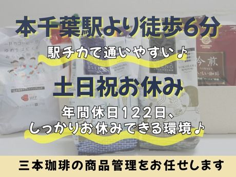 仕事内容 《 食品メーカーでの商品管理です 》 《 取引増加に伴い、商品管理スタッフ新募集! 》 まずは当社倉庫内でのお仕事に慣れていただき、 徐々に商品管理メインでご活躍いただきます。 ・商品の受け取り、荷さばき作業 ・仕入れメーカーへの発注入力や、在庫管理作業(PCでの作業) ・商品のピッキング、積込み作業 ・その他、軽作業、倉庫作業など <扱う商品> ・コーヒーや、パスタ、オリーブオイルなど。 ・ホテルやレストランにご提供する食品を幅広く扱います。 倉庫や発注業務未経験の方OK! 初めのうちは先輩社員が1つひとつ丁寧に教えていきますので安心してください。 本千葉駅から徒歩6分! 駅チカで通いやすい場所です。 1日のお仕事の流れ 9:00~10:00/商品の受け取り 10:00~12:00/発注業務 12:00~13:00/お昼ごはん(お弁当持参や近くでランチ) 13:00~15:00/ピッキングや積み込みの応援 15:00~/在庫管理や発注準備 17:50/退勤 こんな方にオススメ! ・未経験OK、業界経験不問 ・学歴不問 ・ブランクOK ・第二新卒OK ・UIターンOK ・体を動かして仕事をしたい方 ・コツコツ、モクモク作業が好きな方 ・平日日勤のみで働きたい方 ・食品に関わる仕事がしたい ・コーヒーが好き ・フォークリフト作業の経験や資格がある方は活かせます。入社後に取得も可能! ・異業種からの転職歓迎! 営業職や販売員からの転職、工場夜勤からの卒業で商品管理のお仕事を探している方など、 理由は様々かと思いますが、まずはご応募お待ちしております!