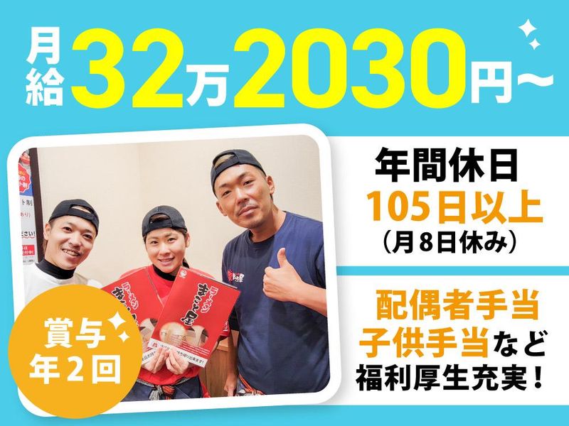 仕事内容 ╋━━━━━━━━━━━━━━━ ★賞与年2回 ★家族手当(1万円) 単身赴任手当(7万円)等手当多数! ★面接1回!即採用可◎ ★有給取得率100% ★エリアマネージャーなど ポスト多数♪ ━━━━━━━━━━━━━━━╋ 子育て支援や家族手当もあり、 学校行事などでの土日休みも可能! ライフステージの変化にも柔軟に対応します! 【仕事内容】 ・ホール/お客様の注文確認、商品提供、レジ ・調理/麺場・焼場(チャーハン等) 仕込みなどのキッチン業務 ・マネジメント/店舗のマネジメント全般 売上管理・スタッフ管理など 売上もこの5年で急激に増加! 2028年までに200店舗、 オープニング計画があるので キャリアアップのポスト多数◎ 成長に拍車をかける為、 一緒に頑張る仲間を募集します。 === 【30代マネージャーより】 まこと屋は店舗の枠を超えて 家族のようなつながりが 生まれる職場です。 困ったときは誰かが手を 差し伸べてくれる環境で、 私自身も悩んだときに幹部が すぐに駆けつけてくれた経験があります。 『仲間と絆を大切にしたい』 そんな方にピッタリな職場です!