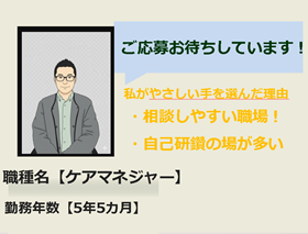 仕事内容 \年間休日124日/ \有給取得日数 平均9.6日/ \産前産後休業 取得→実績あり/ \育児休業 →取得実績あり・復帰率96%/ 【安心のサポート体制】 訪問先でトラブルがあってもすぐに電話で相談できます 利用者さんの人生に寄り添うお仕事 『誰かの力になりたい』そんな気持ちがあれば、ケアマネジャー未経験でも大丈夫です 残業ほぼなし 週休2日制でしっかり休めます ケアマネジャーの研修充実 主任ケアマネなど資格取得支援も充実 仕事のやりがい ケアプランを作成してサービスが実施されます。 作成したプランで自宅での生活のサポートが出来て、自宅での生活を続けていただける事に非常にやりがいを感じます。 感謝をしていただく事はサービスに満足していただいた結果ついてくるものですが、本当にうれしいですね。 ご利用者ごとに、生活歴、感性、お考えは千差万別です。フィットしたケアプランを作成できるまで、ご意見を伺って調整していきます。 私たちの目標はサービスを提供することでご自宅での生活をお手伝いする事ですから、その目標が達成された時にはやりがいを感じます。 スキルアップポイント 限られた時間内に効率よく書類作成します。パソコンに慣れている方、大歓迎です。 研修充実 社内の研修が充実しているので、まだケアマネ業務に慣れていない方でも安心して働けます。