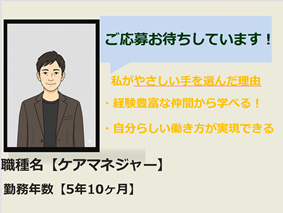 応募資格 応募資格:介護支援専門員、主任介護支援専門員 ■主任介護支援専門員取得予定の方、大大大歓迎