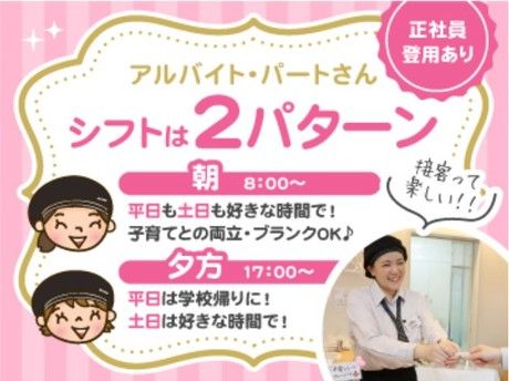 仕事内容 【販売スタッフのお仕事】 ○オープン準備 ・開店前のレジの立ち上げ ・のぼり立て ・店内のお掃除 ・配達物の整理(チルド、冷凍) ・商品の陳列 ○予約準備 ・当日の予約商品の準備 ・熨斗の準備 〇お菓子づくり ・和菓子作り ・焼き菓子づくり ・ケーキのデコレーション ・チョコペンで文字を書く 〇接客 ・商品説明 ・レジ打ち ・ケーキの箱詰め ・予約の受付 ○その他 ・各種製造日報の作成 ・冷蔵庫内の清掃 未経験でも安心!充実の研修とサポート! 未経験の方でも安心して働いていただけるように 充実の研修とサポート体制を整えています。 一番最初は動画で シャトレーゼでのお仕事をご説明。 その後はシャトレーゼの教育マニュアルのもと、 先輩がイチからマンツーマンで教えます! 分からないことがあればすぐに聞いてくださいね。 先輩スタッフがしっかりサポートします! 午前中のみの勤務で無理なく続けやすい◎ 午前中だけ働きたい主婦/主夫の方にピッタリ◎ 午後からは家事や自分の時間など、 プライベートも充実させることが可能! 「扶養内で働きたい」など、 希望があればお気軽にご相談くださいね♪