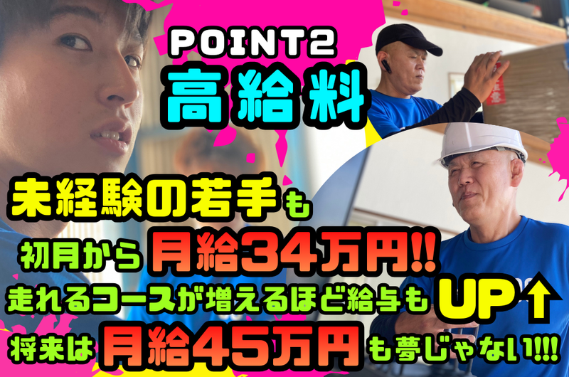 アピールポイント: ✅ 未経験スタートが5割 ✅ 年齢関係なく活躍できる ✅ 配送距離によって昇給もあり ✅ 新しい会社で人間関係が良い(風通し◎)