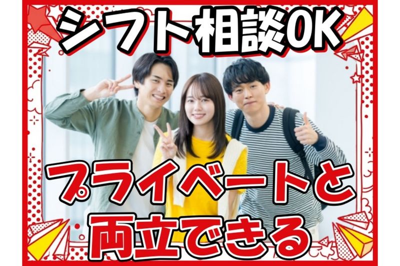 アピールポイント: 人気イベントの裏側を覗けちゃう! 高時給×自由度高めで 働きやすさバツグンの 「超人気バイト」。 おすすめポイントをご紹介! ============== ポイントその1 高時給スタート 未経験の方でも 高時給からのスタート。 月収30万円も狙える環境です! ポイントその2 自由なシフト シフトの希望は いつでも気軽に相談OK! プライベートも大切にしながら 無理なく働けます! ポイントその3 おしゃれOK 髪型・髪色自由で、ネイルもOK! あなたらしいスタイルで おしゃれも楽しみながら働けます。 ポイントその4 未経験でも大歓迎 難しい作業はなく、チームでのお仕事なので 未経験の方も働きやすい! ワイワイ楽しい雰囲気で 友達同士での応募もできるので バイトデビューにもおすすめです。