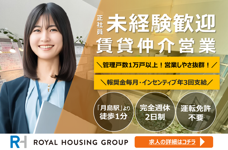 仕事内容 ❖ポイントをサクっと紹介! ✅ 設立50年超え、転勤なしで安定した環境での業務 ✅ 業務改革が進みお客様の提案に集中できる! ✅ 未経験から不動産知識が身に付く! ✅ 100%反響営業・新規飛び込み営業なし! ✅ 完全週休2日(ローテーション制) ✅ 育児休暇もとりやすい環境です。 ✅ インセンティブ年3回支給 ✅ 報酬金もあり/毎月(現金) ✅ 転勤なし。現在住んでいるところ無理なく通えます。 ✅ 管理戸数1万戸以上!営業しやさ抜群! 定員になり次第、募集締め切りいたします。 ぜひ、この機会をお見逃しなく、お気軽にご応募くださいね。 【扱う物件は?】 「分譲賃貸」が多いのが当社の特色。 管理戸数は1万戸を超えており、お客さまへのマッチングがしやすい環境です。 【具体的には?】 ①プロモーション 物件の写真を撮影して、 インターネットに広告を掲載します。 ②物件の提案 お客様のご要望をヒアリング。 それに合った物件をご紹介やご案内します。 ③契約 書類を作成して契約します。 ========================= <給与以上にもらえるお金が多い!> 自身の売上から毎月報奨金をお渡ししています! 年3回支給される業績給などのボーナスなど 給与の他に支給されるボーナスを多く用意しています! ▼支給例 ①【インセンティブ】年3回 ※年3回支給、個人の売上の10%(150万/月の場合15万×4ヶ月分) ※支給条件に下限・上限はありません。頑張った分はしっかりと還元致します★ ②【報奨金】毎月支給 ※報奨金:毎月現金、1年分の管理料の20% ③各種手当あり(宅建手当/月1万5000円、賃貸不動産経営管理士/月5000円) スタッフによっては毎月の給与は貯金して、 報奨金や業績給などのボーナスで生活している方もいます。 <未経験者が活躍中!> 当社入社の9割以上が未経験から入社しております。 元車のディーラー営業、アパレル・スマホ販売、ホテル出身者など、 ゼロからスタートして活躍している先輩社員も多数。 入社後はまず不動産知識や接客マナーをはじめ、 業務の基礎を学んでいただきます。 その後は先輩社員によるロープレや 商談への同席を通じて徐々にステップアップ。 約3ヶ月にわたる研修を経て、独り立ちします。 <100%!完全反響営業> メールや電話などでお問い合わせをいただいお客様や 直接ご来店いただいたお客様にのみ、 物件提案を行っていただく100%完全反響営業なので 働きやすさは抜群! 口コミなどを見てご来店いただくお客様も多く、 当社が設立以来大事にし続けてきた人と人との信頼関係が現在の業績好調と実績に繋がっています◎ <扱う物件は?> 「分譲賃貸」が多いのが当社の特色。 分譲賃貸とは、分譲マンション一戸を購入されたオーナー様が、 賃貸物件として提供をしている部屋のことです。 分譲賃貸は価格帯が高い為、高級物件の取扱いが多い事がメリットです。 売買チームが同じフロアにいるので 普段から売買の情報も入ってきます。 しかも当社が扱う分譲賃貸の場合、賃貸でお任せいただいた物件を 売買仲介に出すといったケースが少なくありません。 自然と売買のことを学べる環境のため、 将来的には売買仲介営業にキャリアチェンジすることも可能です! <先輩がやさしくフォロー> 各店舗には5名~約50名程度のスタッフが在籍。 風通しも良く、面倒見の良い先輩ばかりなので 困ったときは気軽に相談できます。 約3ケ月の丁寧な研修を用意しています。 賃貸はオーナーズエージェント社のツールなど 外部研修まで幅広く用意しています。 売買は社内研修、契約書の本社チェックまで幅広くあります 単身向けからファミリー向けマンションまで幅広く取り扱います <入社後も様々なキャリアの選択肢がある> 当社は賃貸、売買、リフォーム、リゾート仲介、有料老人ホームの ご紹介と様々な部門がございます。 ぜひキャリアイメージをお聞かせください。 <ロイヤルグループについて> 1975年創業、不動産仲介ひと筋に事業を 展開。多くの実績を重ね、まさまざまな 社会貢献により企業としての責任を果たしてきました。 当社のもっとも大きな特徴は、 一人暮らしの住宅からファミリー向け住宅、 リゾート仲介に高齢者の住まいまで、 人の一生のあらゆるステージに必要な 「住まい」すべてに関わるサービスを ワンストップで行なっているということです。 一人のお客様と長くお付き合いすることも あり、そこにやりがいも生まれます。