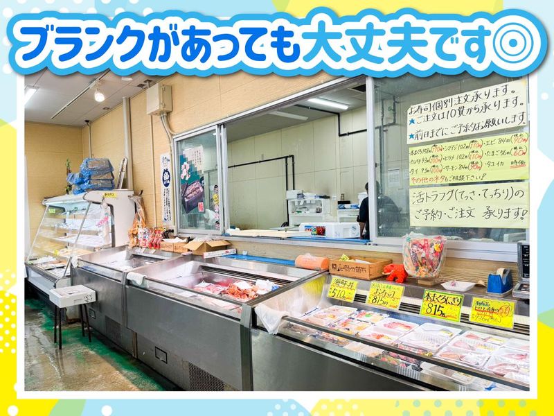 【保険制度】 雇用保険、労災保険、健康保険、厚生年金 待遇・福利厚生 【福利厚生】 ・社会保険完備 ・服装・髪型自由 ・社割あり(お魚をお安く販売) ・副業OK