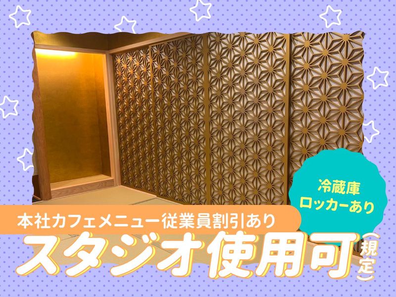 【保険制度】 雇用保険、労災保険、健康保険、厚生年金 待遇・福利厚生 【福利厚生】 ・社会保険完備(該当者のみ) ・交通費規定支給 ・ネイルOK ・髪型・髪色自由 ・私服勤務 ・昇給あり ・大型連休あり ・休憩室あり ・冷蔵庫・個人ロッカーあり ・バイク通勤OK ・自転車通勤OK ・スタジオ使用可(社内規定有) ・本社カフェメニュー従業員割引あり (美味しいメニューを食べられます♪) ココンカフェHP:https://cocon-cafe.uncocon.jp/
