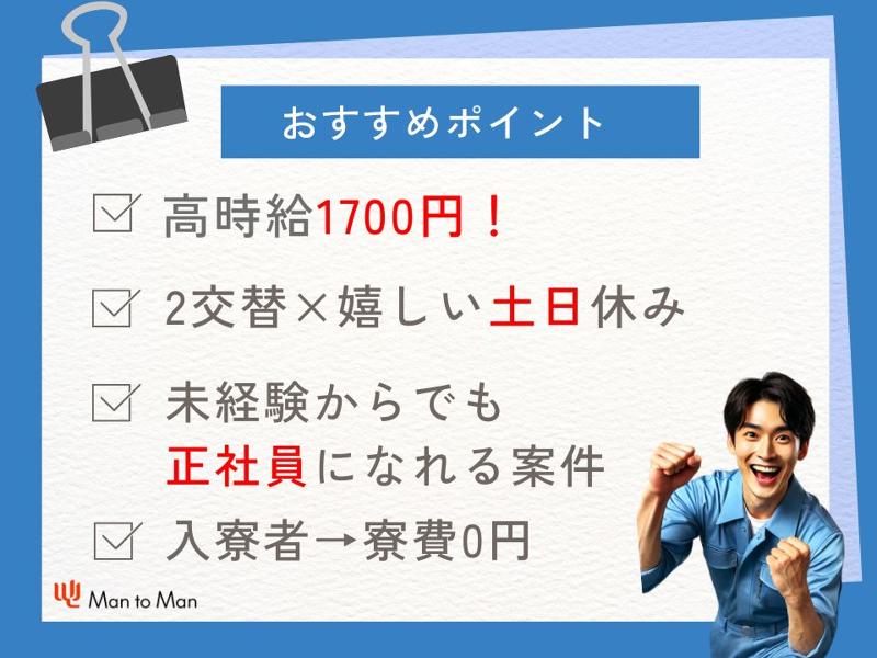 求める人材: 【応募資格】 未経験OK/ブランクOK 特別な知識・スキルは一切不要です。 未経験からスタートした方が半数以上 ーーーーーーーーーーーーーーーーーー Man to Manでは以下の様な スタッフさんが活躍されています。 ・正社員を目指している方 ・派遣社員としてスキルを磨きたい方 ・工場でのお仕事に興味がある方 ・製造業にチャレンジしたい方 ・フォークリフトの資格を活かしたい方 ・男性活躍中の職場で働きたい方 ・20代、30代、40代活躍中の職場で働きたい方 ・寮に住み込みで働きたい方 ・とにかく稼ぎたい方 ・プライベートを充実させたい方 ・年間休日120日以上の職場で働きたい方 ーーーーーーーーーーーーーーーーーーー Man to Manには、 ハローワークや一般求人誌には 掲載されていないお仕事情報も たくさんありますので、 まずはお気軽にお問合せください。