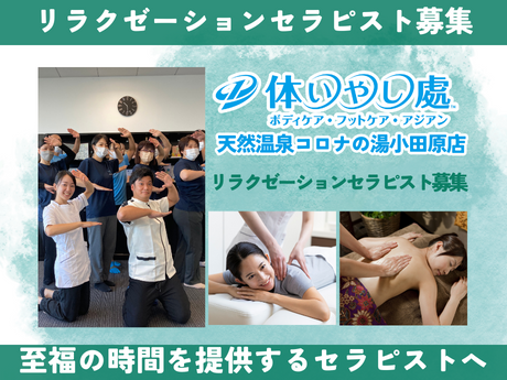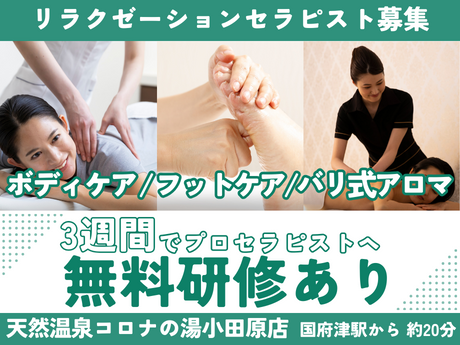 求人詳細 【業務委託】リラクゼーションセラピスト 【給与】 ◆仕事の単位: 施術 ◆最低報酬額: 2376 円 ◆業務所要時間:60分 ◆合計給与額: 2376 円 【シフト】 週3日以上、1日6時間以上 【勤務地】 小田原市 【最寄り駅】 【小田原コロナワールド内】リラクゼーションセラピスト大募集します。 月額最大24万円の報酬保障制度で業務委託が初めての方でも安心して働けるようサポート制度を整えています! 丁寧な研修がありますので、未経験の方でも始められます! 《注目ポイント》 ◆本気で学べる、本気で育てる◆ エーワンが一番大切にしていることは人財の育成です。 人財こそがエーワンそのものと考えています。 働くセラピストを1番大切に考え、健康で長く働ける技術、環境を提供します。 私たちは、社会を健やかで豊かにするお手伝いをしている会社です。 *未経験の方でも安心の研修制度* 業界屈指の研修専門施設で、 『結果の出せる技術』を丁寧にレクチャーします。 経験者の方はこれまでのスキルを更に磨くことができるため、 スキルの幅が広がります! 経験豊富な講師陣が、熱意を持ってイチから全て伝授します! 試用期間詳細 試用期間なし 勤務期間 長期(3ヶ月以上) 特徴・メリット 高収入・高時給/体を動かす仕事/すぐ働ける/リゾートの仕事 待遇・福利厚生 詳細 ◎指名手当(全額バック) ◎昇給有(査定制度有) ◎各種表彰 ◎無料研修制度有(講習料会社負担) ◎国内・海外研修制度 ◎リラクゼーションセラピスト2級、1級受験資格取得 ◎フォロアップ、スキルアップ研修制度 ◎共済会(傷病見舞金・災害見舞金、結婚、出産祝い金、慶弔金、懇親会など) ◎MVP表彰制度 ◎スキルup研修制度 ◎寮完備 ◎報酬保障制度 ◎社員登用制度有 ◎結婚祝金20,000円 ◎傷害保険 ◎懇親会費支給 ◎社内レクリエーション ◎自社コスメ割引 ◎車・バイク・自転車通勤可 休日について フリーシフト制 希望考慮 ☆土日祝に出られる方歓迎 ☆月間150時間以上実働出来る方は優遇 研修制度 未経験の方には、最初に合宿研修あり、その後OJTを実施します。 店長、マネージャー、講師、人事など多角的なフォローアップ体制があります。 資格取得支援制度あり 応募後のプロセス 下記ご参照ください。 応募先電話番号 0120-980-552 応募と今後の流れ ●応募フォームよりご応募 ↓ ●面接可否を、電話もしくはメールにてお知らせ致します。 ※ドメイン指定受信の解除を予めして下さい。 ↓ ●担当者と面接(WEB面接可) ↓ ●採用決定 ↓ ◎入社 ※採用方法が変更となる場合もございますので、ご了承ください。 【面接地】 本社または現地・現地周辺にて