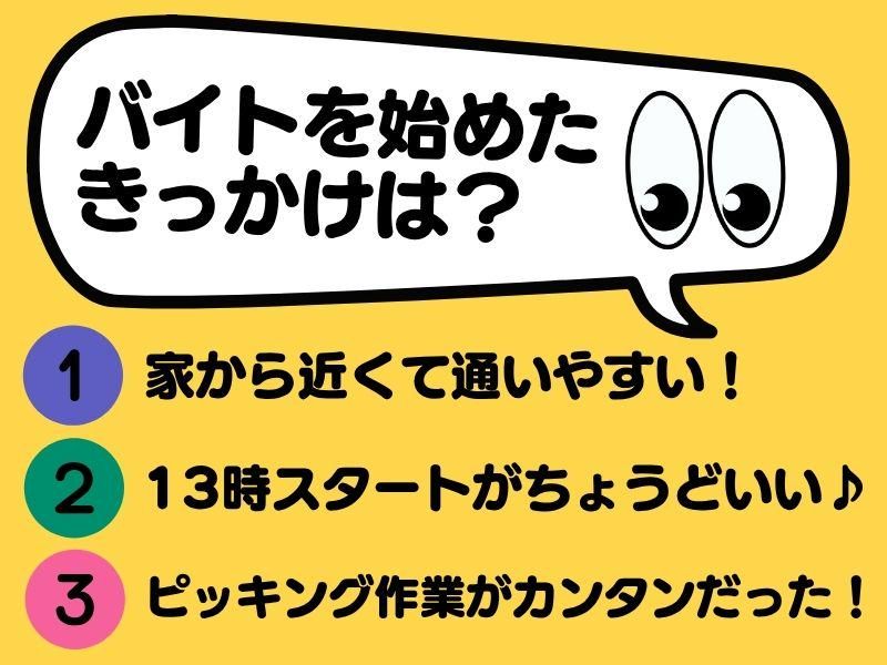 仕事内容 \事業拡大に伴う増員募集!/ 午後からのシフトだから、 午前は家事や育児に使える♪ 週2日~・1日4h~OK! 土日入れる方は大歓迎♪ 主婦(夫)さん・Wワーカー活躍中✨ シフトの相談OK♪ 柔軟に対応いたします٩(ˊωˋ*)و✧*。 ・・・・・・・・・・・・・・・・・・・・・・・・・・・・・・・・・・・・・・ 【働き方のポイント】 ✅ 午後から勤務で家事と両立しやすい♪ ✅ 扶養内勤務・短時間WORK ✅ 簡単ピッキング&未経験でも安心 ✅ 平日のみ・土日のみ勤務もOK! ✅ シフト融通ききます◎ ・・・・・・・・・・・・・・・・・・・・・・・・・・・・・・・・・・・・・・ シンプル・簡単な軽作業です!  ̄ ̄V ̄ ̄ ̄ ̄ ̄ ̄ ̄ ̄ ̄ ̄ ̄ ̄☆* ̄ ̄ ペット用品を扱う倉庫内での ピッキング作業です♪ 商品棚に行って、 ハンディで「ピッ」とスキャン →商品を集めるだけ! 重いものはほとんどナシ♪ 未経験スタートの方が ほとんどなのでご安心ください◎ ※立ち作業メインですが、 体に負担はかかりにくい内容です。 ・・・・・・・・・・・・・・・・・・・・・・・・・・・・・・・・・・・・・・ 主婦(夫)スタッフさんより一言✍  ̄ ̄V ̄ ̄ ̄ ̄ ̄ ̄ ̄ ̄ ̄ ̄ ̄ ̄☆* ̄ ̄ 子育てもだいぶ落ち着いてきたし、 そろそろお仕事しようかな~ と思いながら求人サイトを見て ここに決めました! 子どもがいるので急な体調不良で お休みをいただくこともありますが、 みなさんとても優しく嫌な顔せず お休みさせていただいています。 家から近いことから応募しましたが、 仕事内容も難しくないですし コツコツと作業するのが苦でない方なら 活躍できるお仕事だと思います!