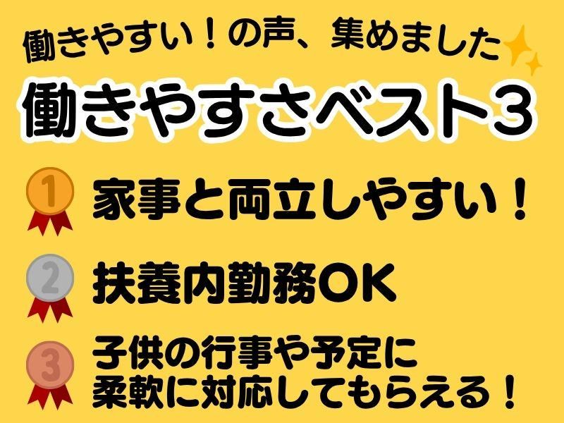 職場環境 10代/20代/30代/40代/50代と 幅広い年齢の方が活躍中! シフト相談しやすく、お子さんの 体調不良などにも柔軟に対応◎ 冷暖房あり・休憩室あり・ 私服にエプロンでOK! 喫煙所:喫煙所あり(屋外)