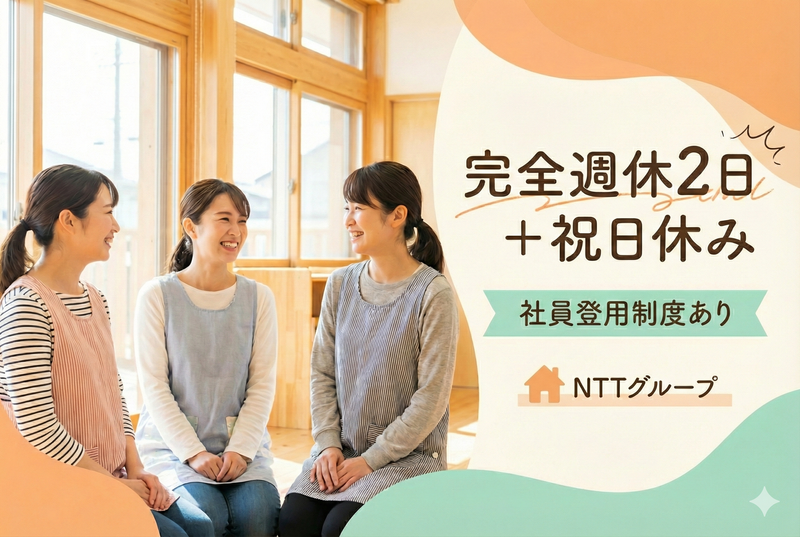 仕事内容 *<NTTグループだから安心!充実した待遇・福利厚生>* *<保育の安全性を向上させるための人員増強>* *<ブランク・経験ゼロでもOK!丁寧研修で成長を応援>* *<月給24.3万円!>* *<完全週休2日+祝日休みでノビノビ働ける>* <仕事内容> NTTグループが運営している、 「子どもルーム」でスタッフ大募集! ・屋内、屋外遊びの付き添いと見守り ・学習時間の見守り ・おやつの準備、提供 ・イベントの準備、運営 (お誕生会、かき氷大会など) ・施設の清掃、消毒、環境整備 などの業務を通して、 放課後や長期休暇中の 小学生の見守りをするお仕事です。 ※40〜50名の児童に対し、 2~3名のスタッフで対応します。 仕事内容は先輩がレクチャーするので、 学童保育・児童福祉・教育などの経験が 一切ない方でもスタート可能です! <大手NTTグループで社員登用を目指せる!> <人員増強!未来を支える子どもの保育を一緒にしませんか?> <完全週休2日のシフト制でメリハリバッチリ> <月給24.3万円!収入面での不安もナシ> *【求人のポイント】* ・丁寧な導入研修で不安なく成長可能 ・年間休日125日!趣味や家庭との両立も可 *【職場環境】* ・持ち帰り仕事は一切なし! ・定時でご帰宅いただけることがほとんどです! ・40代や50代以上のスタッフも多数在籍! ・20代/30代の若手スタッフ活躍中 ・年齢や社歴に関係なくコミュニケーションが活発 ・わからないことがあっても質問、相談しやすいです 施設周辺にはスーパーやコンビニもあり、仕事が終わったらお買い物をして帰宅も可能♪ 小学校の敷地内に子どもルームがあるため、住宅地も近く通勤が負担にならない職場環境!