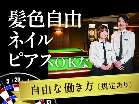 仕事内容 ◆ビリヤードやダーツが楽しめるお店! 機械操作案内・ご案内・注文取り・料理運び等を通じて、お客様の楽しい時間を演出してください。 まずは明るい挨拶ができればOK! 他のスタッフと協力しながら、 お客様が楽しく過ごせる空間を 一緒に作っていきましょう。  ̄ ̄ ̄ ̄ ̄ ̄ ̄ ̄ ̄ ̄ ̄ ̄ ̄ ̄ ̄ ̄ ̄ <Bane BAGUS(バネ バグース)ってどんなお店?> スタイリッシュなバーとエレクトリックダーツが融合した、都内最大級の本格ダーツバーです。ダーツだけでなくビリヤード、卓球、カラオケ、シミュレーションゴルフなども楽しめ、プロの指導もあるなど本格的!開放的でおしゃれな店内はいつも多くのお客様で賑わっています。リーズナブルかつハイクオリティの料理やお酒も当店の自慢!!お酒や料理の種類も豊富です!(でも調理は難しくありませんのでご安心ください♪)。楽しく働きながらいろんな技術が身につきますよ! <大人の遊びを覚えよう> ビリヤードやダーツは、覚えておけば必ずどこかで役に立ちます!たとえば将来、就職した会社の仲間で飲み会終わりにビリヤードやダーツに行ったりすることもあるかもしれません!そんな時にサラっとできればカッコよくないですか?バイトしながら覚えておいてソンはないですよ!? <同年代の仲間たちと> 一緒に働くのは10代・20代・30代・40代のメンバー。ここで出会った仲間は一生モノ!新たな人間関係を作りたい方、人生リスタートしたい方、仲間を増やしたい方にピッタリです! <アルバイトデビューも大歓迎> 今働いているメンバーの大半は未経験からスタートし、一人前になりました。仕事はやっているうちに覚えていきますが、最初はできなくても大丈夫。先輩たちが教えてくれます。ただ教えてもらうのを受け身で待つのではなく、わからないことは遠慮なく聞いてくださいね。「自分でなんとかしよう」という姿勢も大切ですが、最初のうちは聞いたほうが早いことも多いです。積極的に聞ける人のほうが仕事を覚えるのが速いですね。 ≪飲食店での経験者大歓迎!≫ カフェ、ファミレス、居酒屋、ラーメン店、イタリアンなど、前職のジャンルは問いません。ホール・キッチンはもちろん、調理補助やバリスタ、バーテンダーの経験も活かせます。ブランクがあっても大丈夫!あなたのスキルを即戦力として評価します。