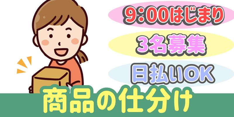 仕事内容 倉庫内での食品や飲料などの仕分けのオシゴト ・シール貼り ・積み替え作業 ~など 未経験でも問題ナシ!丁寧に教えてもらえます 出張面接いたします!就業前の職場見学OK! まずは、ご応募からお待ちしております! 18歳~40代後半の女性活躍中 ・就業場所は、坂戸西スマートIC 近郊 オススメpoint ・日曜日+他1日休み ・午前と午後に小休憩あり!リフレッシュできます! ・食堂あり ・動きやすい服装で就業OK ・ロッカーあり ・駐車場完備 マイカー通勤OK ・未経験者OK ・日勤のお仕事お探しの方 ・長期で働きたい方 ・かんたん軽作業ご希望の方 ・もくもく作業がお好きな方 ・平日休みで役所などにも行きやすい ・1月あたりの平均残業時間20h 【こんな経験活かせます!】 パート、アルバイト、契約社員 雇用形態問わず、下記の経験ある方は活かせます! ・倉庫内(構内)作業 ・工場作業 ・軽作業 ・選別 ・ラベル貼り ※もちろん必須ではありません! まずはお気軽にご応募ください ///////////////////////////////////////// (WEBでご応募の場合) お電話番号を記入していただくと ご案内がスムーズです。 /////////////////////////////////////////