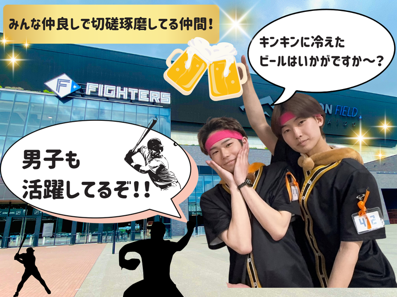 求めている人材 <販売未経験大歓迎!> ・WワークOK ・高校生 ・大学生 ・フリーターさん ・野球が好きな方 ・わいわい楽しく働きたい方 ・負けず嫌いな方 ・体を動かすのが好きな方 ・周りに流されない方 ・笑顔とやる気に自信のある方 ・ネイル、ピアスはルールの範囲内であればOK! <<夢や目標に向かって努力している方、またこれから探す方>> 女性だけが主役じゃない! 男性の方々もご紹介いたします! いとけん君:札幌出身の大学2年生。 一昨年4月に売り子デビュー。 好きな食べ物はメロン。 趣味は筋トレ、陸上と弓道やっていました。 年間の売上NO1目指して、頑張ります。 えーしゅん君:札幌出身の大学2年生。 一昨年4月に売り子デビュー 好きな食べ物はパイナップル。 趣味はスノボー、誰とでも仲良くなれるのが 特技の元卓球部です。 持ち前の笑顔を武器にタイトルホルダー狙います。 つかまこ君:札幌出身の大学2年生。 一昨年4月に売り子デビュー。 好きな食べ物は家系ラーメン。 趣味はスノボー、特技はバスケ(15年続けています) 同期の女子達(売れっ子)が、重たいビールを背負って たくさん駆け回っているので、僕たちも負けられません。 放課後に一緒に汗流して、青春しませんか!? *今シーズンだけではなく 来シーズンも活躍頂ける方、大歓迎です! \\ こんな方も歓迎! // ・飲食(居酒屋、カフェ、バー)や 販売(スーパー、パン屋、コンビニ、アパレル、雑貨屋)など、接客経験がある ・単発や短期アルバイトでイベントスタッフをしたことがある