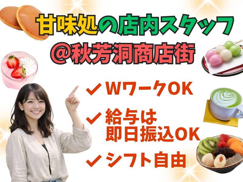 職場環境 秋芳洞商店街にある甘味処♪ 最大12日間の短期です✨ 35名の大量募集なので、未経験の方も安心してスタートできます☆ 20代~40代の女性・Wワーカー・フリーター・学生さん活躍中!