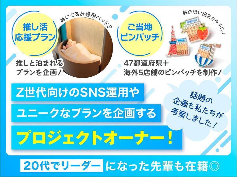 仕事内容 / 20代~30代男女活躍中! あなたのアイデアが、 全国330店舗の発信力になる! 「本物の影響力」と「SNS運用実践経験」 を若手のうちから培える環境です✨ \ SNS投稿や記事の「ただの作成者」ではなく 「プロジェクトオーナー」として、 企画立案段階から担当するホテル広報。 「推し活応援プラン」 「Z世代向けSNS運用」など ユニークなプランをイチから作り上げます! 20代でリーダーポジションに ついた先輩も在籍。 実力次第で早期キャリアアップ可能です! 【 業務内容 】 ✅SNS運用 ✅記事作成 ✅写真・動画撮影と編集 ✅サイト更新 などプロジェクトオーナーとして 立案→実行→分析までを 一貫して担当します。 実際に『推し活応援プラン』や 『常連様向けバスツアー』などの さまざまなプランを展開しています。 ≪ 具体的には… ≫ ▶SNS・Webサイトの戦略企画・運用 ▶キャンペーン・イベント用の撮影・編集 ▶プレスリリース・記事企画 ▶社内連携・企画ブラッシュアップ ▶その他付随業務 ★「指示待ち」ではなく、 自分でPDCAサイクルを 回していけるのが魅力! 経験年数を問わず「やってみたい」と 提案し、実践していきます。 若手でも意見が尊重されるからこそ 企画の成功も失敗も ご自身の判断と行動で左右される やりがいと成長環境があります! ※SNS運用や写真撮影、 文章作成などの経験がある方は 即戦力としてご活躍いただけます。 ✦・┈┈┈┈┈ ・✦✦・┈┈┈┈┈ ・✦ 広報チームでは、 チームごとに色々な 企画を担当しているので その中の1部をご紹介します☘ ◆推し活応援プランの企画✨ ぬいぐるみやアクリルスタンドと一緒に お泊りできるセット付きプランの 企画・発信。 Z世代の心理を理解し、 設計・検討・改善を行います ◆海外向けSNS運用✨ 多言語での戦略立案や数値分析など ホテルの魅力を世界へ発信。 グローバルなキャリアへ踏み出せます ◆常連様向けバスツアーの企画✨ 10泊以上ご利用いただいた お客様を招待するツアーの 企画~実施まで担当。 参加者対応なども経験します ◆スタッフ向け コミュニケーションアプリの企画✨ スタッフ約1.8万人の情報共有や エンゲージメント向上を実現。 組織への影響力を実感できます ✦・┈┈┈┈┈ ・✦✦・┈┈┈┈┈ ・✦ ▼この仕事で得られるスキルは… ━━━━━━━━━━━━━━━ ✔デジタルマーケティングの実践スキル ✔若年層向けブランディング経験 ✔SNS運用の数値分析力 (エンゲージメント改善等) ✔ブランド広報のコンテンツ企画力 (企画→実行→検証のPDCA) ✔大規模組織での発信力 ✔ステークホルダーマネジメント経験 など 3年で市場評価の高いスキルが身につき、 広報のみにとどまらない マーケティング・事業開発層への 成長を目指せます! ▼働きやすさのポイント! ━━━━━━━━━━━━ ✔年間休日120日&残業少なめ✨ ✔月給24万5500円スタート❗ ✔賞与年2回→例年3.5ヶ月分実績有! ✔昇給あり!評価制度も充実◎ ✔社員割引で旅行もお得に♪