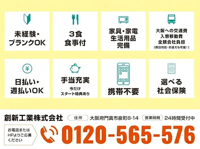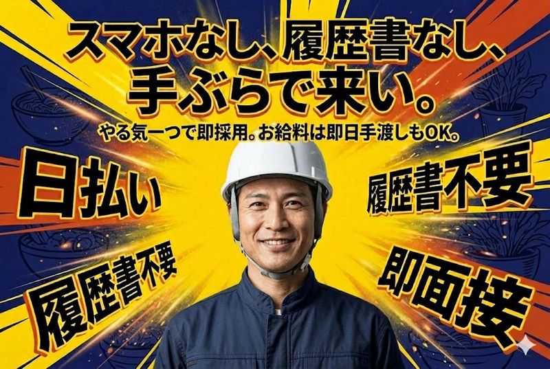 仕事内容 【電話で応募OK】0120-565-576 「人生の再スタート、全力で応援します!」 明日からの「住む場所」「温かいごはん」「安定した仕事」すべて用意して待っています。 ■ 選べる仕事内容 あなたの経験や希望に合わせて、最適な現場をお任せします。 経験者の方(解体工・重機オペ・鍛冶工など) 即戦力として、そのスキルを高く評価します。「驚きの経験者手当」を多数用意しているので、前職以上の待遇も可能です! 未経験者の方 現場スタッフの「かんたんなお手伝い」からスタート。 ・頼まれた道具を渡す ・ホコリが立たないように水をまく ・手押しカートで材料を片付ける ・現場の草抜きをする …など 重たい機械の操作や難しい作業は一切ありません。 やり方はすべて丁寧にお教えします。 ■ 「カバン1つ」で来てください!充実の生活サポート 仕事を頑張るためには、まず生活の安定から。当社では以下の待遇を完備しています。 きれいな個室寮完備: すぐに入居可能です。 あたたかい3食付き: 毎日の食事に困ることはありません。 必要なものは全貸与: 道具や服はすべて貸し出し。作業着は新品をプレゼントします。 オシャレも自分らしく: 髪型・髪色自由、ピアスもOK。 ■ 当社で働くメリット 仕事量が安定していて「食いっぱぐれない」 地下鉄建設、大型イベント準備、駅周辺の整備など、現場は常に豊富です。「稼ぎたいのに仕事がない」「待機ばかりで給料が減る」という不安とは無縁です! 過去の経歴は一切不問 「派遣を転々としていた」「転職回数が多い」「ブランクが長い」そんな先輩たちも、今では中心メンバーとして活躍中。あなたの「これから」を重視します。 ステップアップも応援! フォークリフトやガス溶接、重機運転などの資格取得を全額サポート。資格を取ればその分給料もアップします! ■ 応募について 「まずは話を聞きたい」だけでもOK!いきなりの面接も歓迎です。 こちらからお近くまで伺うことも可能です。 「何もない、持っていない。そこからでも始められる場所がここにあります。」 少しでも気になったら、まずは一本お電話ください!