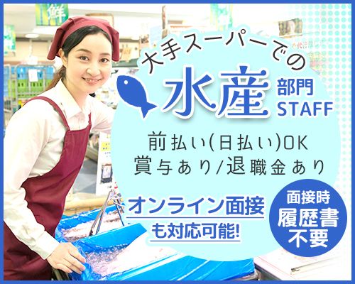 メッセージ お魚のカットや パック詰めなど裏方メイン♪ イオン系列スーパーでの 水産部門スタッフ募集です! 「接客は苦手…」という方にピッタリ♪ モクモクと作業に 集中できる環境で働けます♪ 【おすすめポイント】 ・高時給1,750円スタート! 未経験からでもしっかり稼げます♪ ・給与の前払い制度あり! 「急な出費が…」という時も安心です。 ・主婦さん多数活躍中! 家庭と両立しながら働きたい方にもぴったり! <オンライン面接OK>しゅふさん活躍中☆久しぶりのお仕事復帰・パートデビューも大歓迎です! 労働者派遣事業(派01-301493)
