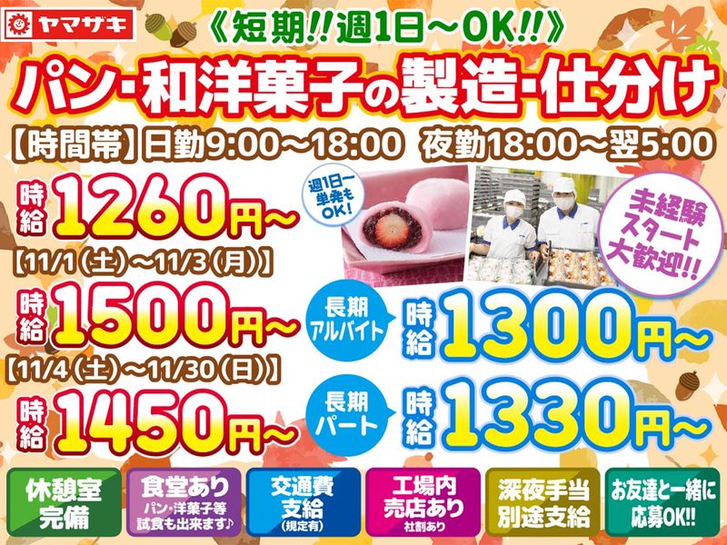 仕事内容 *・・・*・・・*・・・*・・・*・・・*・・・* 《短期スタッフ募集!!》 決まった作業を決まった手順で◎ そんなシンプル作業が中心です♪ 先輩が丁寧にサポートしていきます! *・・・*・・・*・・・*・・・*・・・*・・・* 《⭐期間限定時給で稼ぎも◎⭐》  ̄ ̄ ̄ ̄ ̄ ̄ ̄ ̄ ̄ ̄ ̄ ̄ ̄ ̄ ̄ ̄ 下記期間は「時給1450円~1650円」 ⏩11/1(土)~12/31(水) ※詳細は給与欄参照 ※短期アルバイトスタッフのみ ★創業70年以上!! 有名な食パンや菓子パンなどを 食卓にお届けするお仕事です♪ スーパーやコンビニでお馴染みの 食パン・菓子パン・調理パンや和洋菓子、 おにぎりetc… 様々な製品を日々製造しています。 扱う数は約1200種類、 1日の製造数は約3000万個!! 仕込み→成型→焼成の製造工程を経て、 包装して仕分け作業に入ります。 仕事内容も多岐にわたるので 飽きることなく働けます♪ =============== 《交通アクセス》 小平駅より徒歩14分! ⭐バイク・自転車通勤OK! 萩山駅、久米川駅、青海街道駅、 八坂駅、花小金井駅、新小平駅、 一橋学園駅、東村山駅、小川駅、 国分寺駅、田無駅、東久留米駅 …などからもアクセス便利◎ =============== 《応募後の流れ》 応募→説明会・面接→勤務スタート! 応募後、説明会を行い面接を実施します。 【勤務地・面接地までの行き方】 「小平駅」北口より徒歩3分のバス停から ぶるべー号に乗車→ 大沼地域センター公園、下車徒歩5分 当日はラフな格好でOK! 1~2時間程度で終了します。 面接前に聞きたいことなどございましたら、 お気軽にお問い合わせ下さい♪ ※応募書類の返却はしておりません。 =============== ■実際に働いているスタッフの声■ 好きな日にちにシフトを入れられるので 自分の都合に合わせて働けるのが とても助かっています♪ 作業も簡単で気楽ですし、 食堂も363円~と安いので効率良く稼げます。 隙間時間で働けるので、 気づいたら長年働いていた! という方も沢山いらっしゃいます。